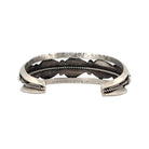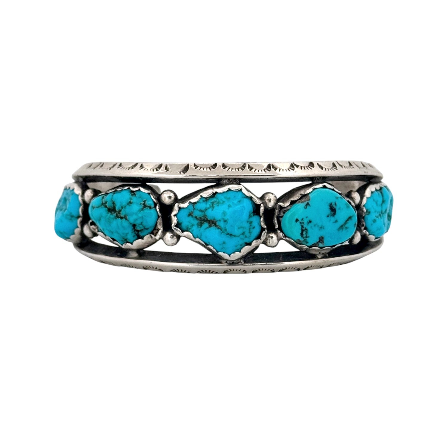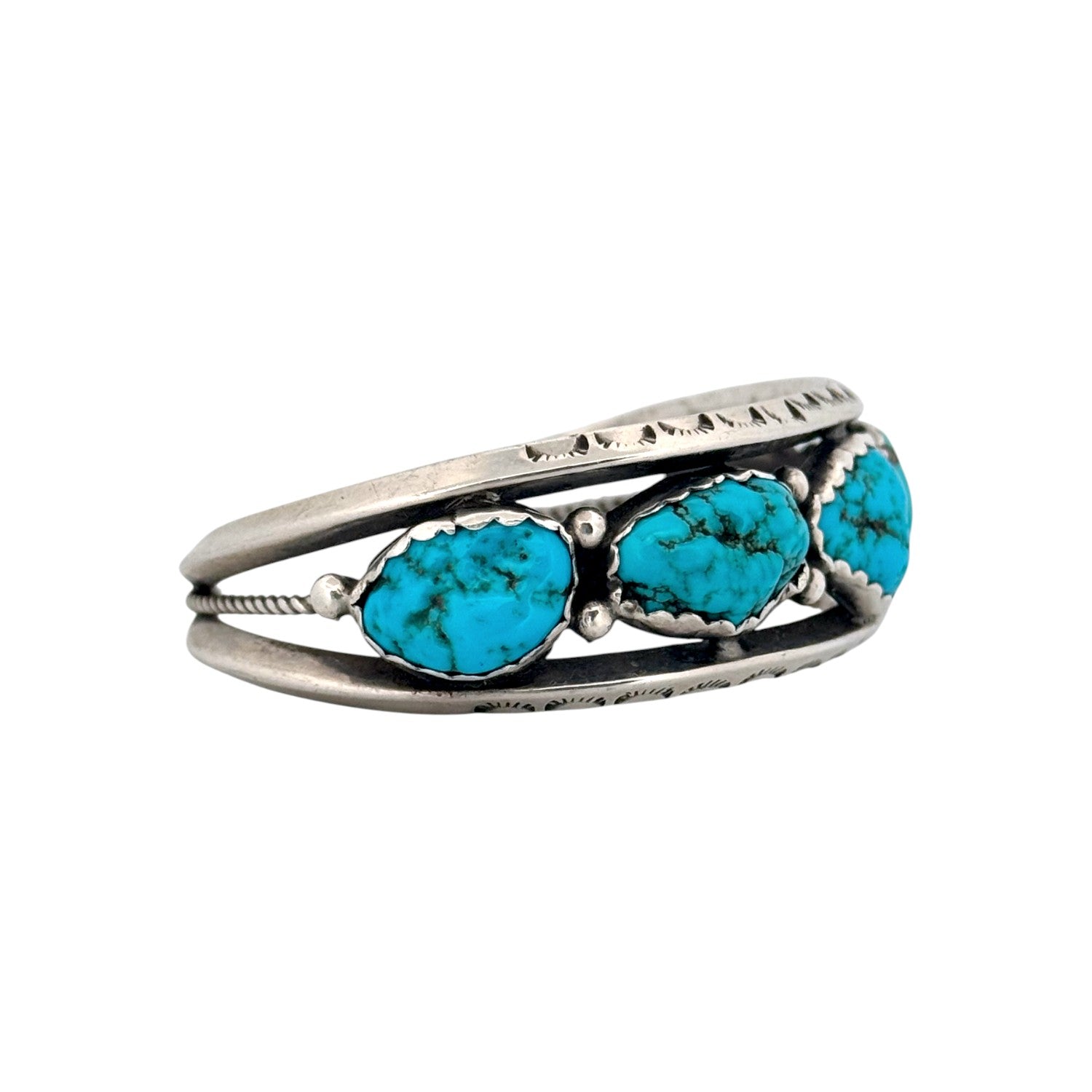 This stunning Navajo handmade bracelet beautifully showcases the luminous blue tones of Sleeping Beauty Turquoise, one of the most sought-after stones from Arizona. Each turquoise stone is carefully hand-set in a polished sterling silver bezel, framed by delicate stamp work and silver bead detailing that enhance its natural beauty. The elegant split-shank design provides both balance and comfort, making it ideal for everyday wear or special occasions. The stones’ sky-blue hue contrasts gracefully against the oxidized silver background, emphasizing the depth and artistry of the piece.