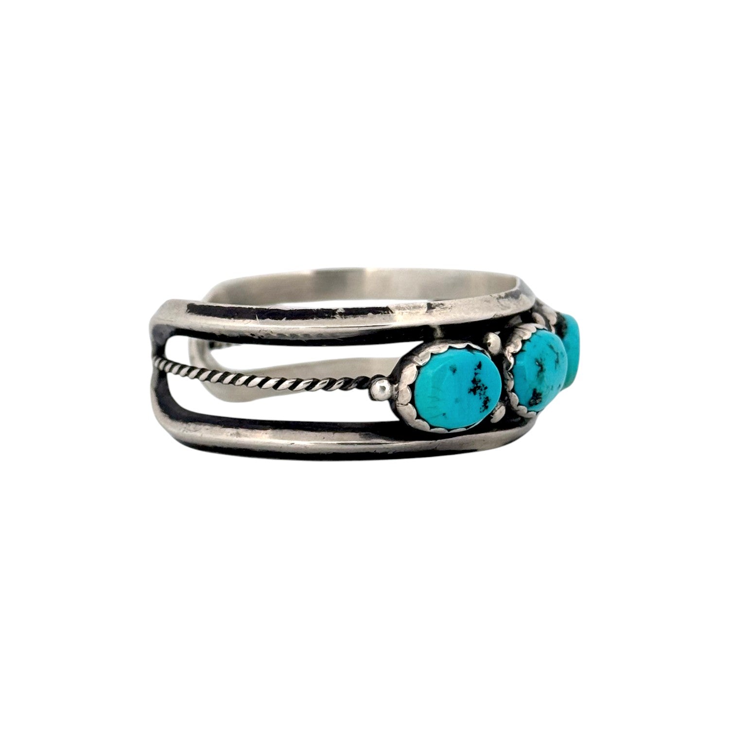 This elegant Navajo handmade bracelet showcases the timeless beauty of Sleeping Beauty Turquoise, known for its brilliant sky-blue hue and minimal matrix. Each stone is carefully hand-set in polished sterling silver, framed by intricate hand-stamped designs that highlight traditional Navajo artistry. The split-shank cuff style gives the bracelet a balanced, open feel, while the detailed silverwork adds a refined touch of craftsmanship. Bold yet graceful, this piece captures the essence of Southwestern design and natural elegance. The smooth turquoise stones radiate tranquility, making it a perfect accessory for any occasion.