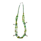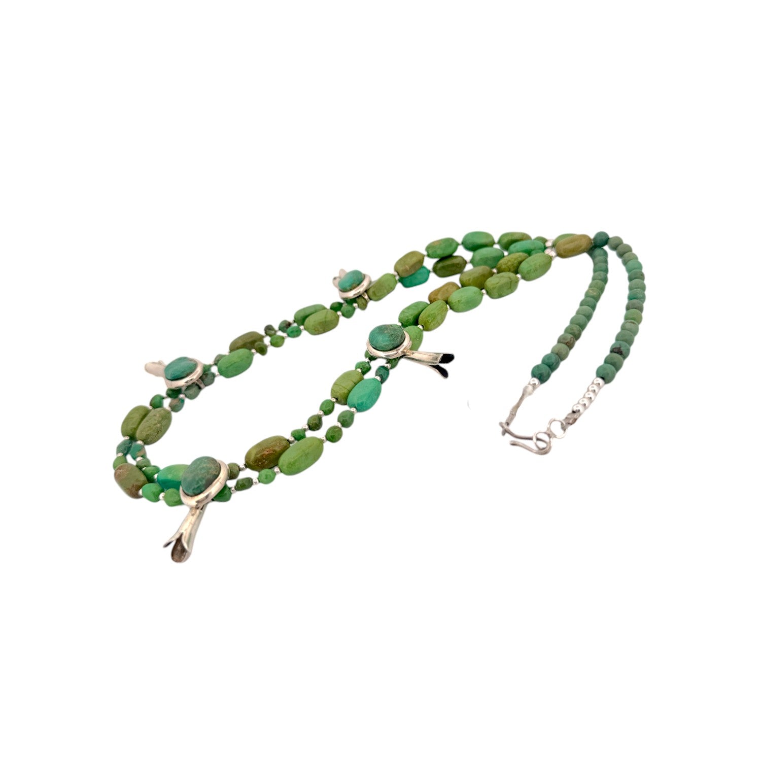 This Navajo handmade necklace features vibrant Damele turquoise stones in a rich range of greens, from soft apple tones to deep mossy hues. The double-strand design is accented with three sterling silver naja-style stations, each set with a polished turquoise cabochon for added depth and artistry. Every bead is hand-selected and strung with care, showcasing the unique matrix and character that Damele turquoise is known for. The sterling silver elements provide a refined contrast, enhancing the necklace’s traditional Southwestern elegance. Bold, rare, and beautifully crafted, this piece is a striking example of Navajo craftsmanship and the distinctive beauty of Damele turquoise.