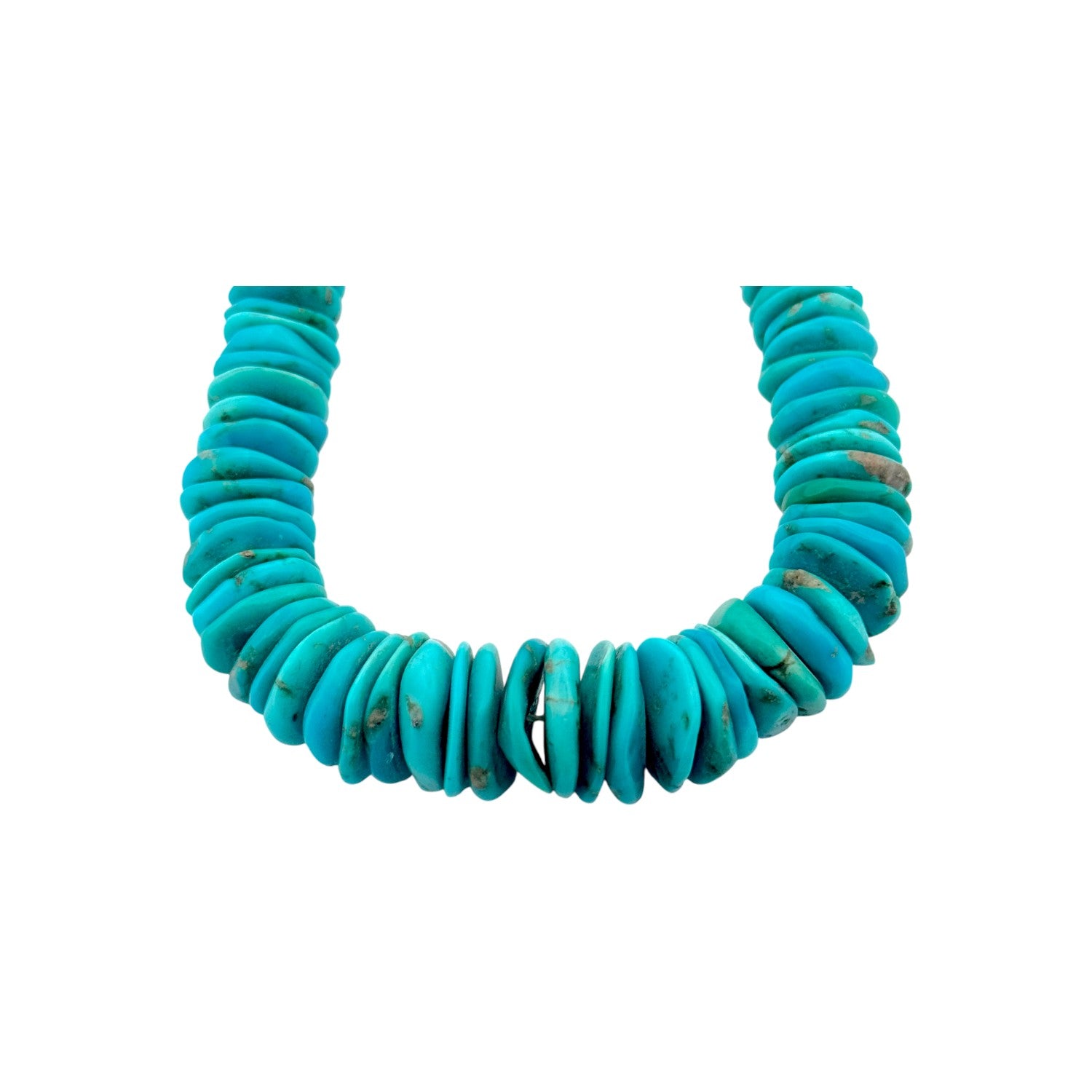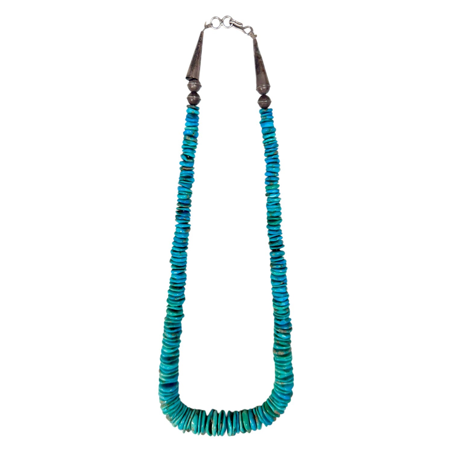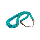 This Navajo handmade necklace features vibrant Kingman turquoise heishi, expertly shaped and arranged for a rich, natural gradient of blues and greens. Each bead is individually crafted, giving the strand a beautifully organic texture and traditional character. The turquoise is accented with sterling silver beads and graceful silver cones that add balance and elegance to the overall design. Its classic Southwestern aesthetic reflects skilled artistry passed down through generations. This necklace is a timeless statement piece that honors authentic Native craftsmanship and the celebrated beauty of Kingman turquoise.
