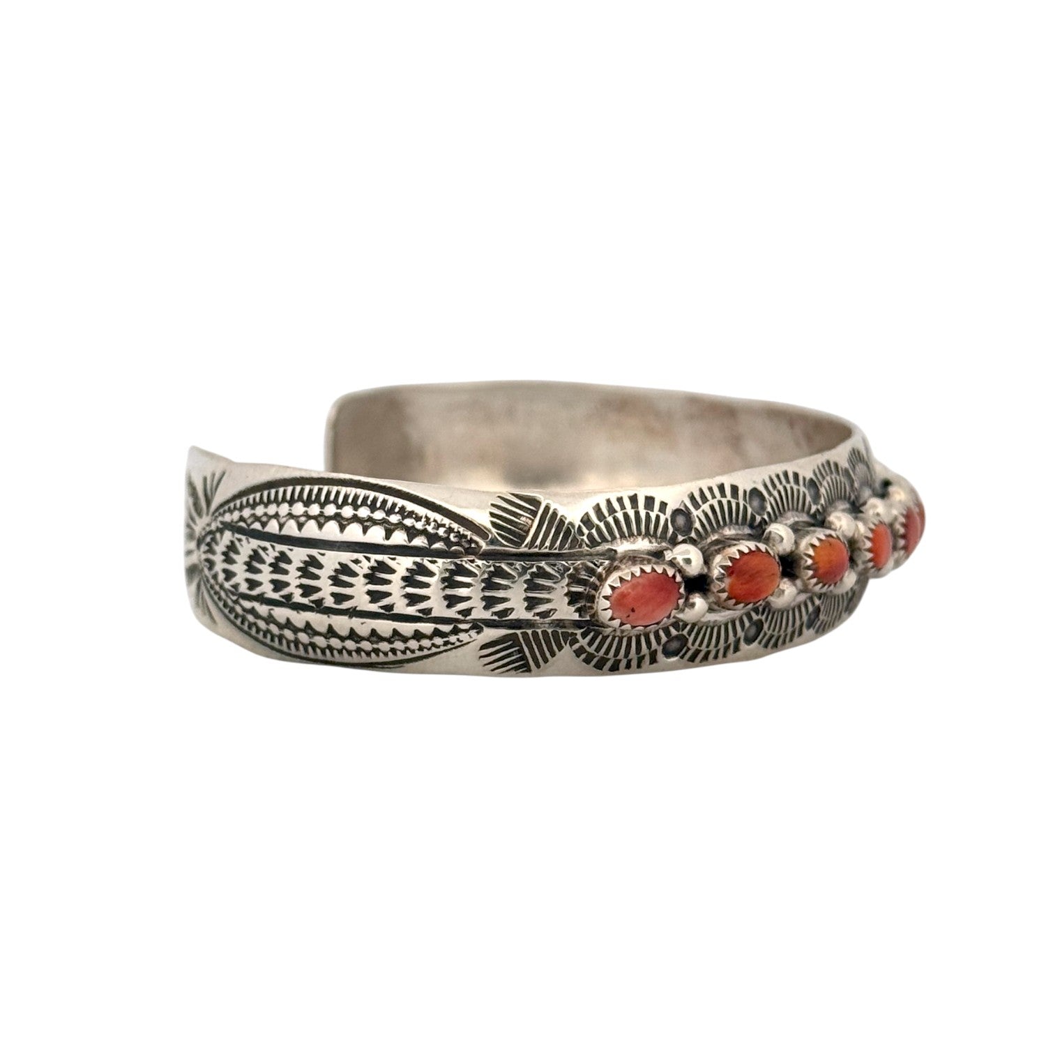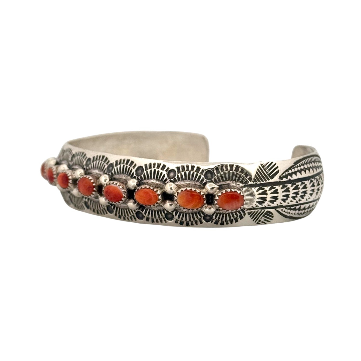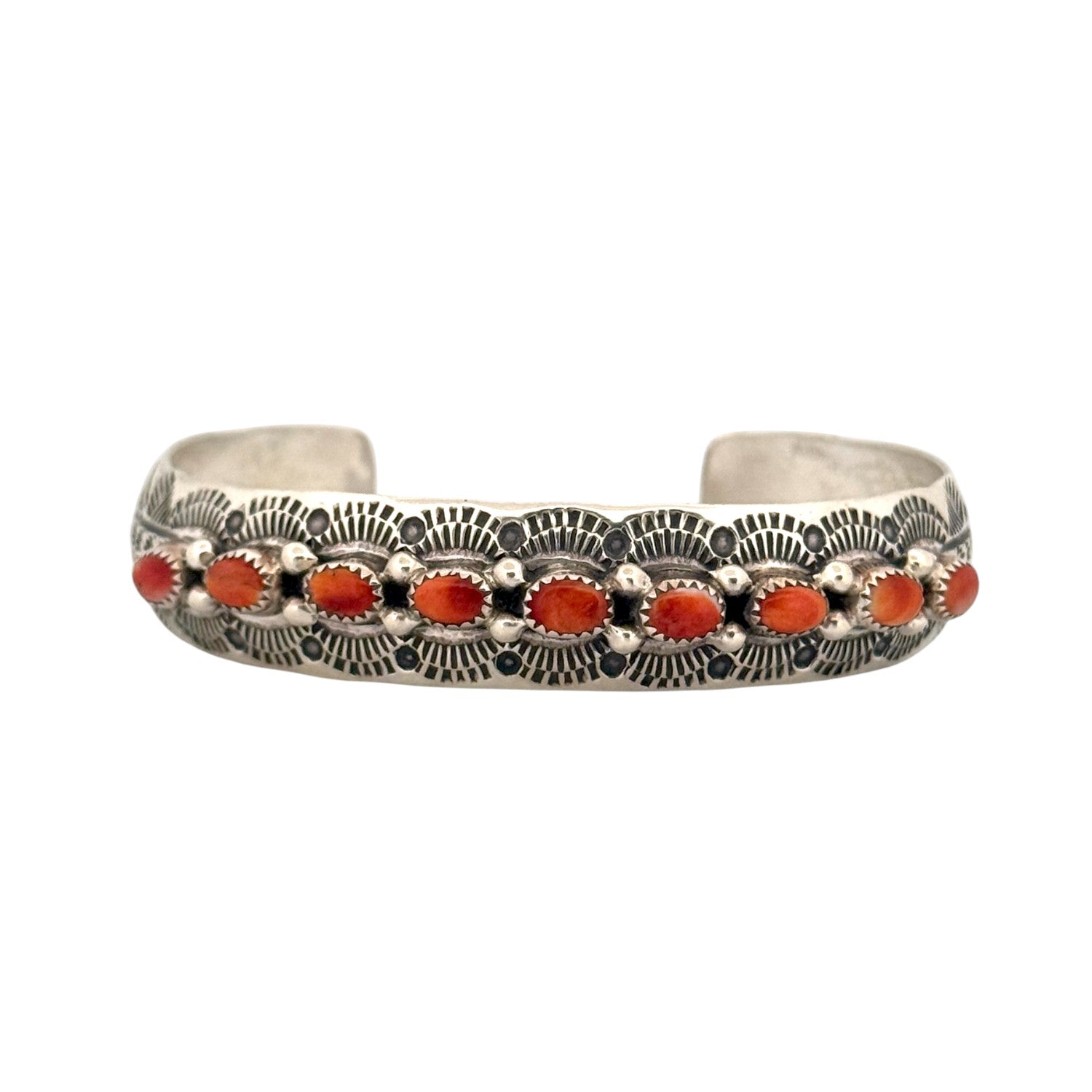 This exquisite Navajo handmade bracelet features a radiant row of Red and Orange Spiny Oyster Shells set in fine sterling silver. Each shell is carefully hand-cut and bezel-set, showcasing vibrant shades that range from deep coral red to warm sunlit orange. Traditional Navajo stampwork and bead detailing frame the stones, creating a stunning harmony of color and texture. The intricate silverwork highlights the skilled artistry and cultural symbolism of Navajo craftsmanship.