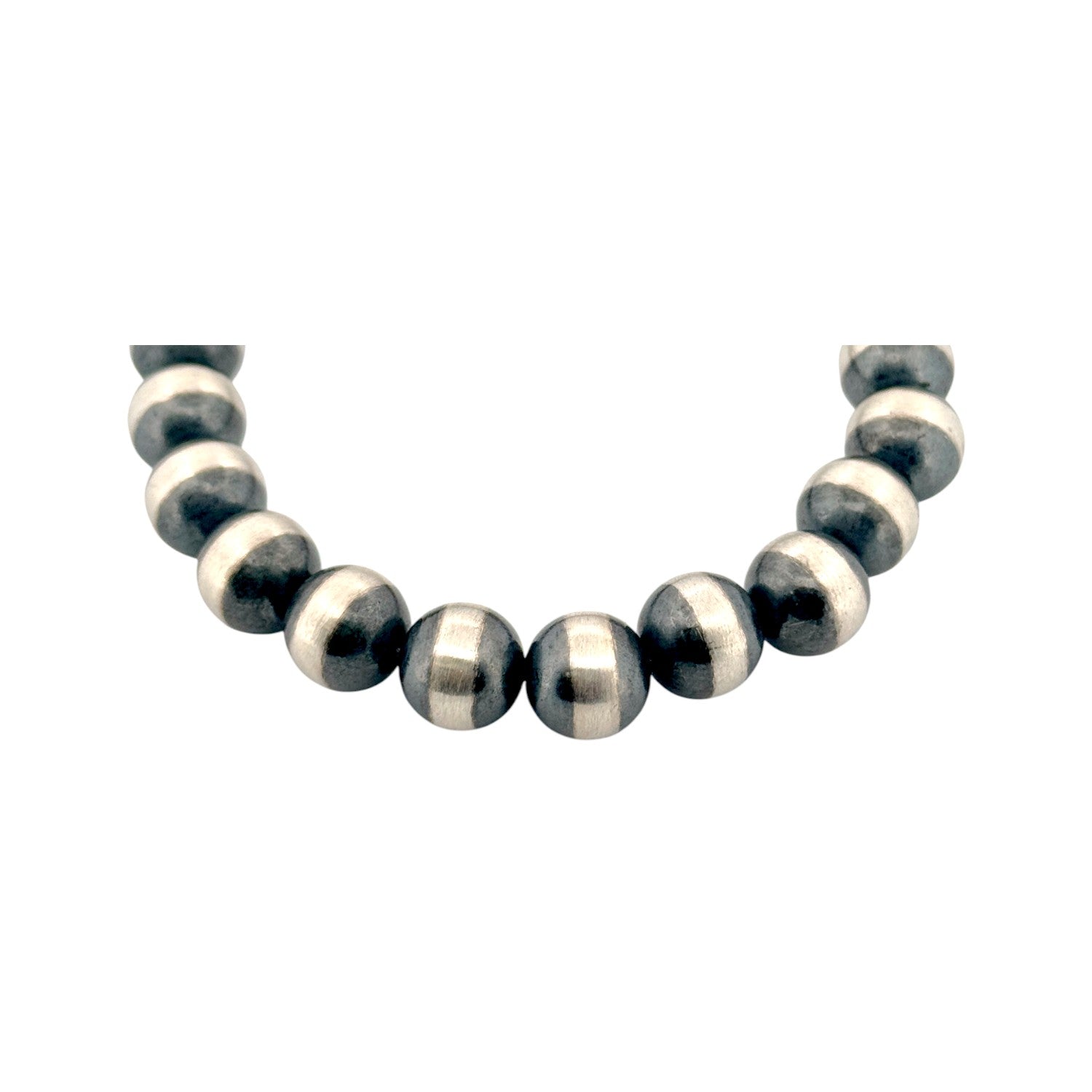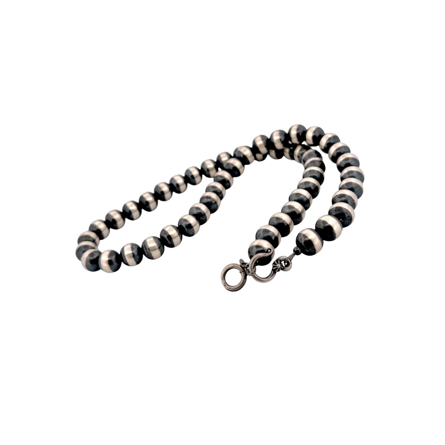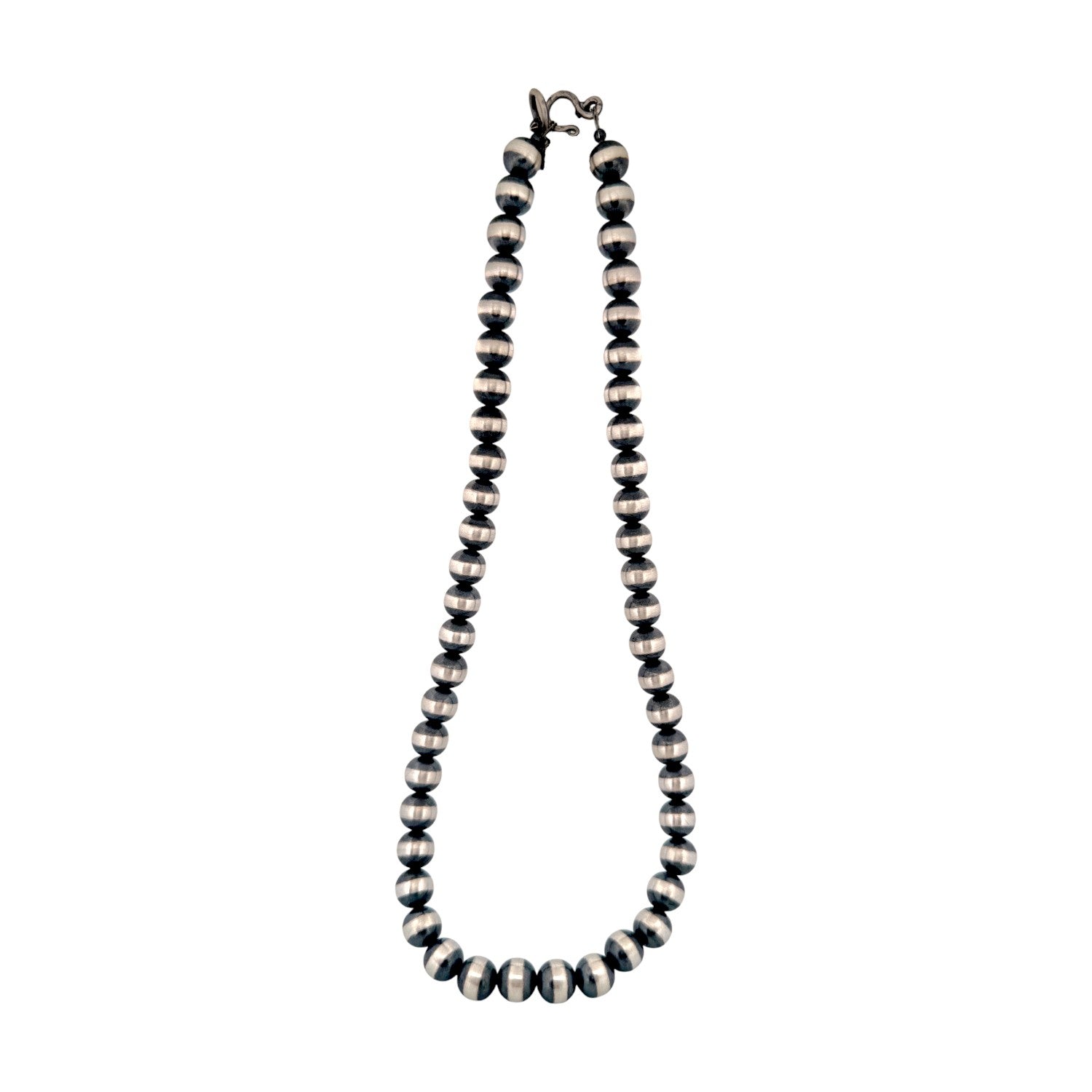 This refined necklace features 6mm machine-made sterling silver pearls, offering a sleek and timeless design. Each bead is carefully hand-strung by a local Native artisan, showcasing precision and pride in traditional craftsmanship. The polished silver pearls reflect light beautifully, creating a classic Southwestern elegance. Perfect for layering or wearing alone, it complements any style with effortless sophistication. A graceful expression of Native artistry and enduring beauty.