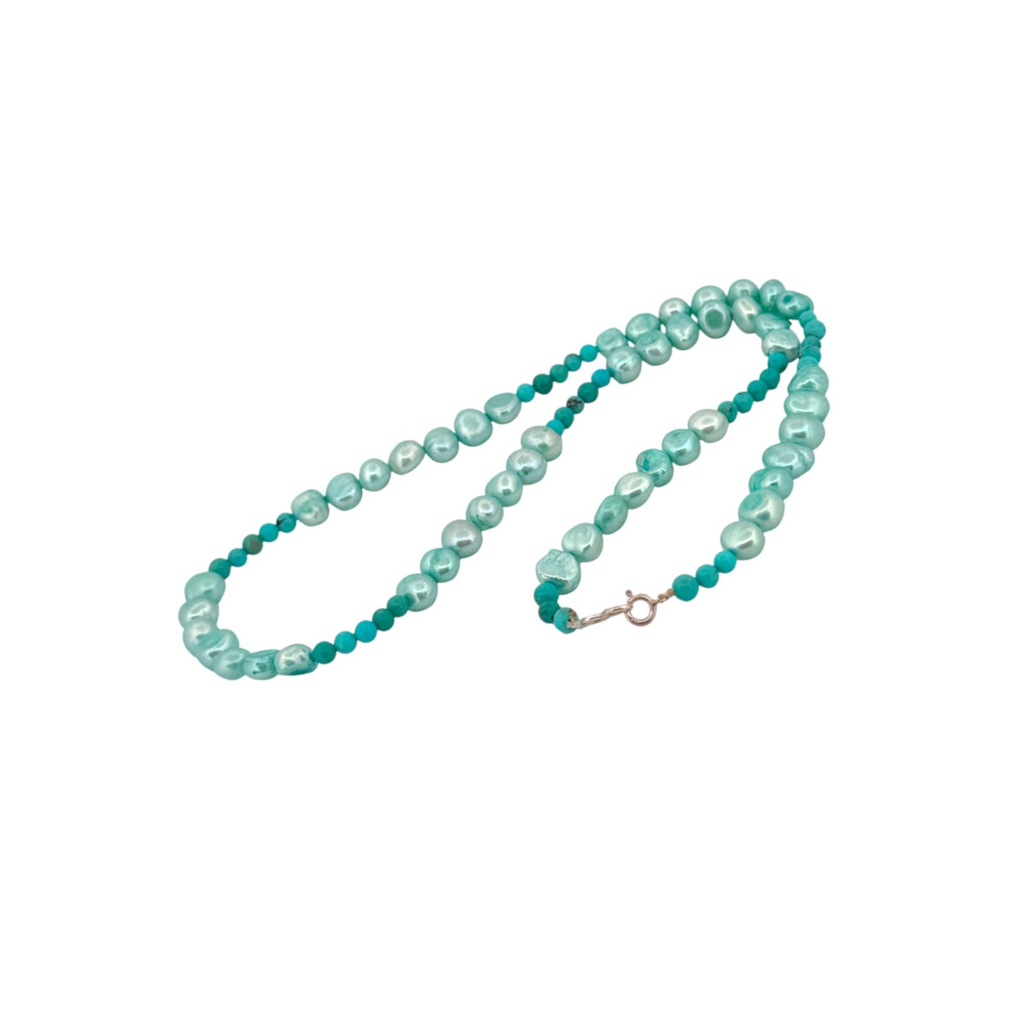 This stunning necklace with genuine Kingman turquoise and luminous pearls gives a fresh, elegant Southwestern look. Each bead is hand-strung by a local Native artisan, ensuring authenticity, balance, and thoughtful craftsmanship throughout the design. The smooth turquoise beads add vibrant color, beautifully contrasted by the soft glow of the pearls. Sterling silver findings provide lasting quality and a refined finishing touch. Lightweight and versatile, this necklace is perfect for everyday wear or as a standout piece for special occasions.