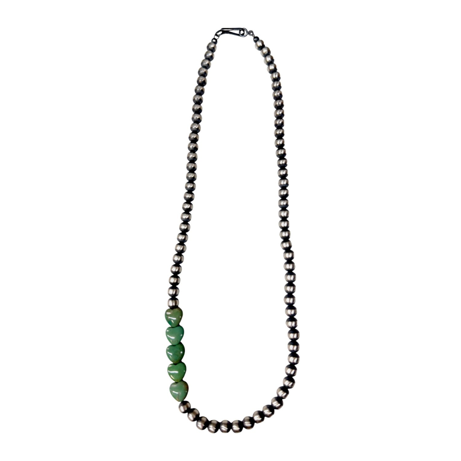This elegant necklace features machine-made silver pearls paired with rich Kingman turquoise accents, creating a timeless balance of cool silver tones and vibrant natural color. Each bead is meticulously hand-strung by a local Native artisan, reflecting generations of skill and cultural tradition. The oxidized sterling silver adds depth and dimension, enhancing the brilliance of the turquoise throughout the strand. Designed for both everyday wear and special occasions, it drapes beautifully and brings classic Southwestern sophistication to any look. With its refined craftsmanship and authentic materials, this necklace is a meaningful addition to any jewelry collection.