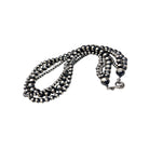 This stunning multi-strand necklace showcases machine-made silver pearls in graduated sizes, creating a dramatic yet timeless silhouette. Each strand is expertly hand-strung by a local Native artisan, reflecting generations of precision, artistry, and cultural tradition. The oxidized sterling silver adds rich depth and dimension, enhancing the natural sheen of every bead. Designed to make a statement, this piece drapes beautifully and elevates any outfit with classic Southwestern elegance. Bold, refined, and authentically crafted, it is a standout addition to any high-end jewelry collection.