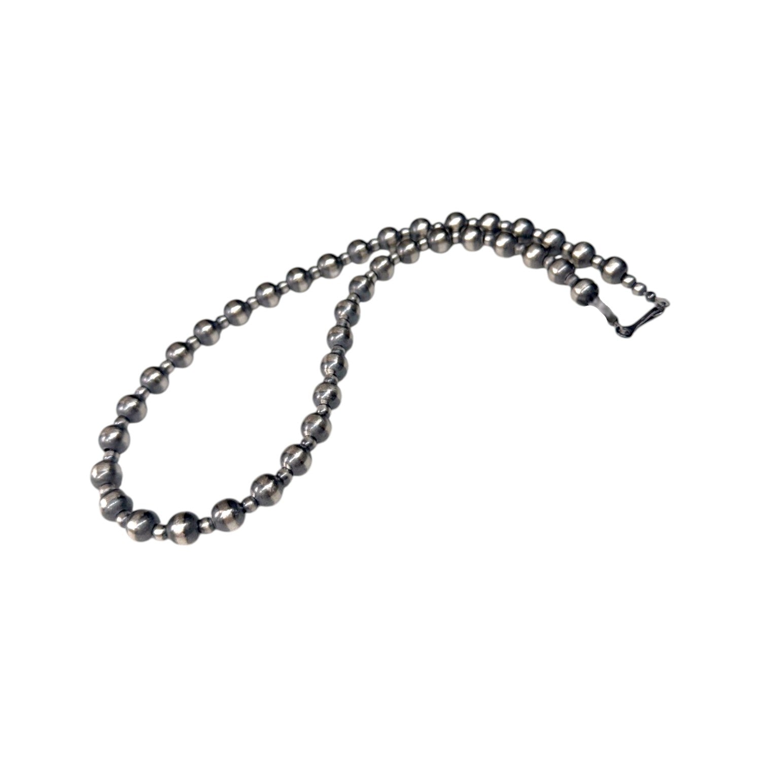 This timeless necklace features polished machine-made silver pearls expertly strung by a Native artisan for a classic Southwestern look. The strand is beautifully graduated, with larger beads at the center that taper gracefully toward the clasp for a balanced silhouette. Each silver pearl reflects light with a soft luster, adding depth and understated elegance to the design. The simplicity of the piece highlights the enduring appeal of traditional Native-inspired silver jewelry. Perfect worn alone or layered with turquoise favorites, this versatile necklace is a staple for any collection.