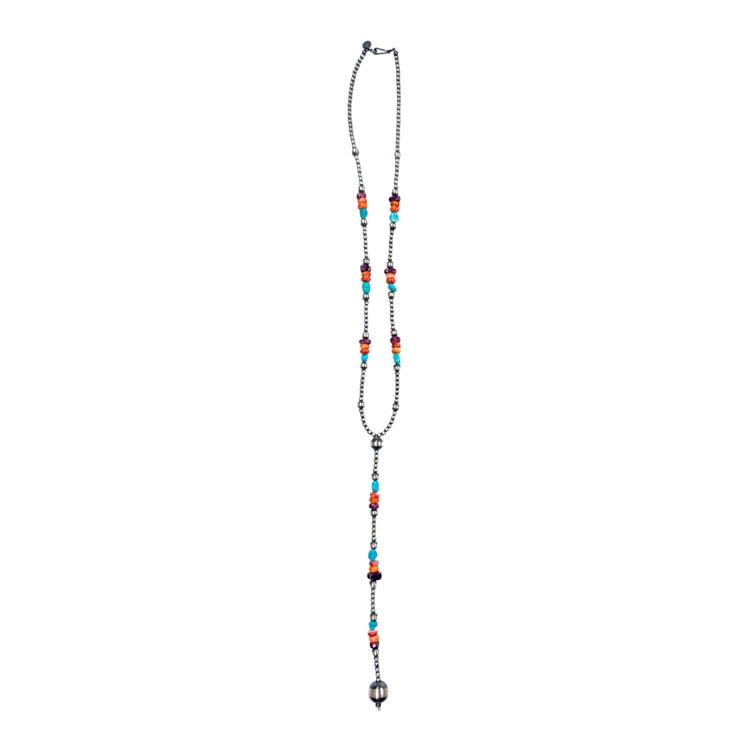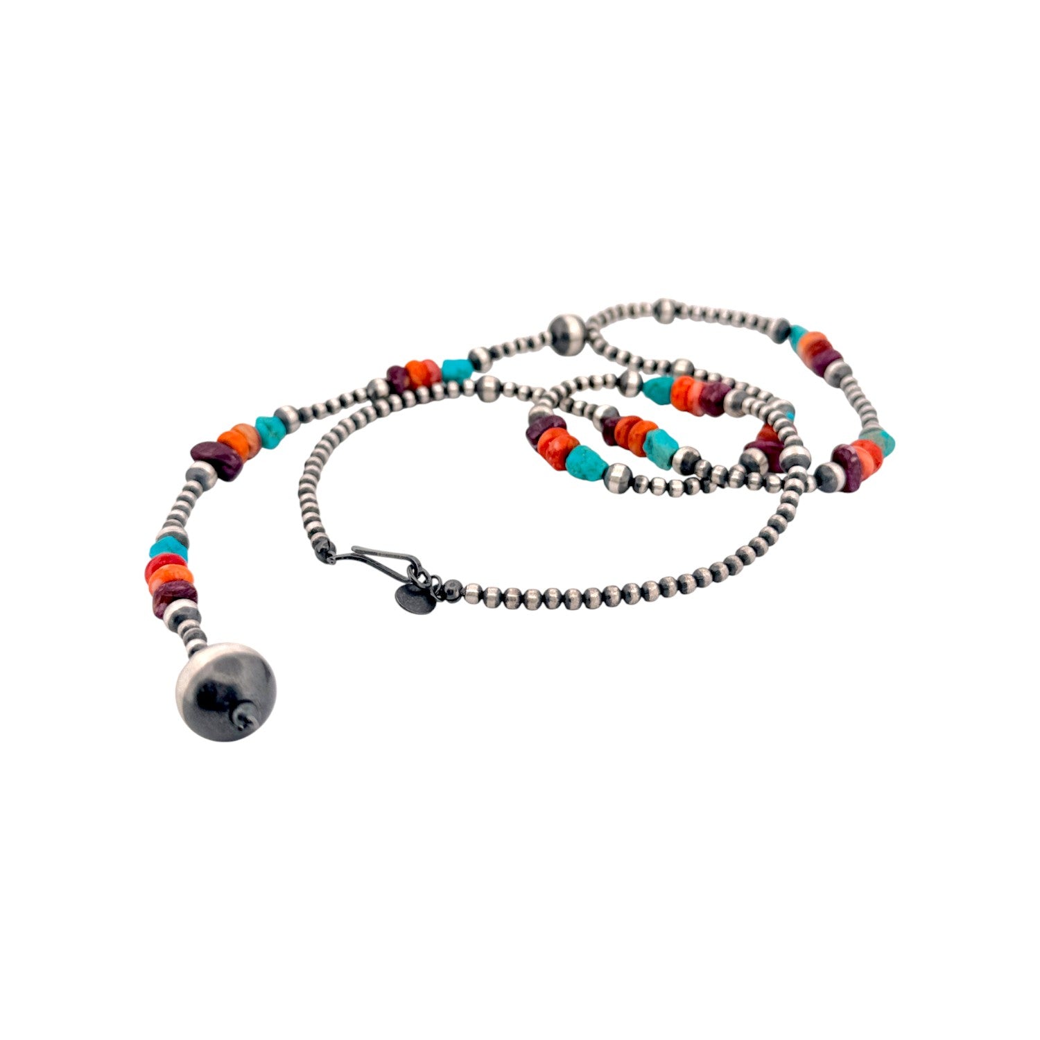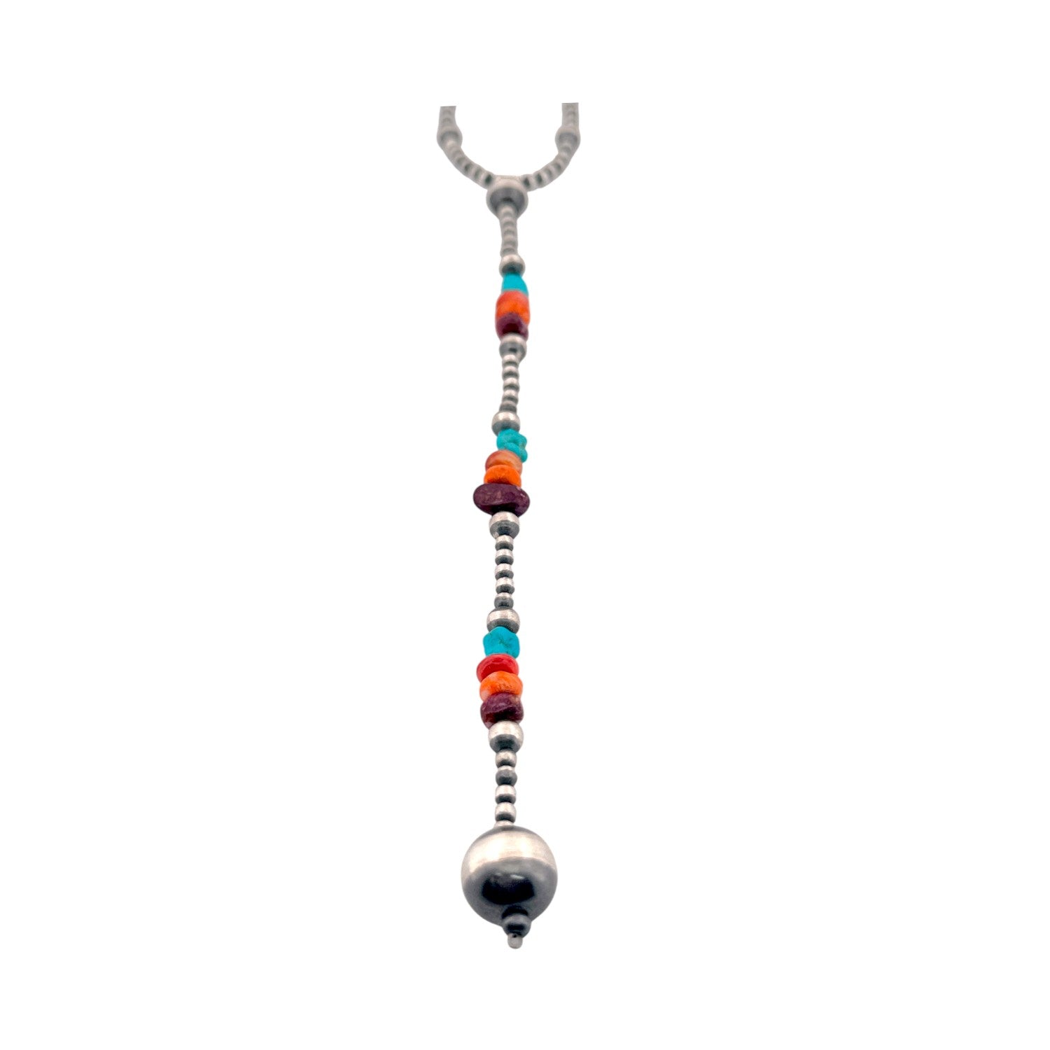 This vibrant necklace features machine-made sterling silver pearls paired with an array of multi-stone gems. Each bead is carefully hand-strung by a local Native artisan, reflecting a perfect harmony of skill and creativity. The colorful stones bring life and character to the polished silver, creating a captivating Southwestern design. Versatile and elegant, it complements both casual and formal wear. A beautiful celebration of Native craftsmanship and artistic expression.