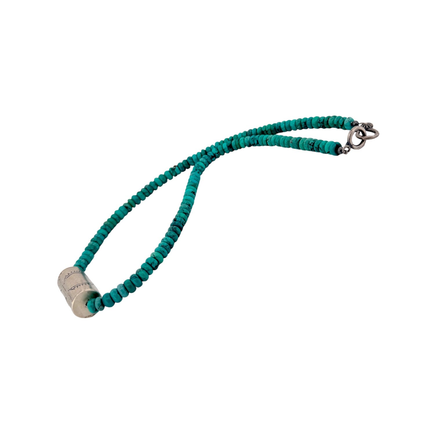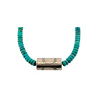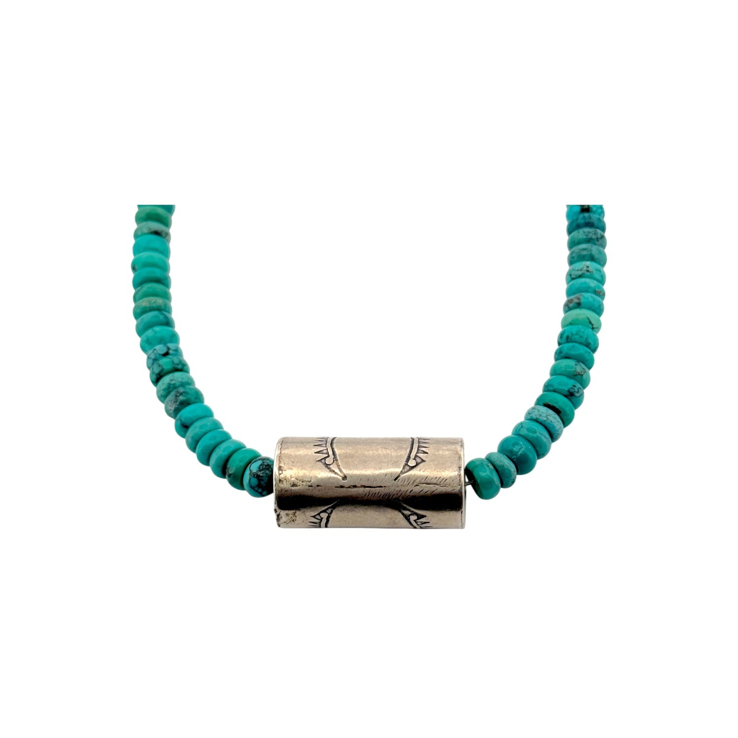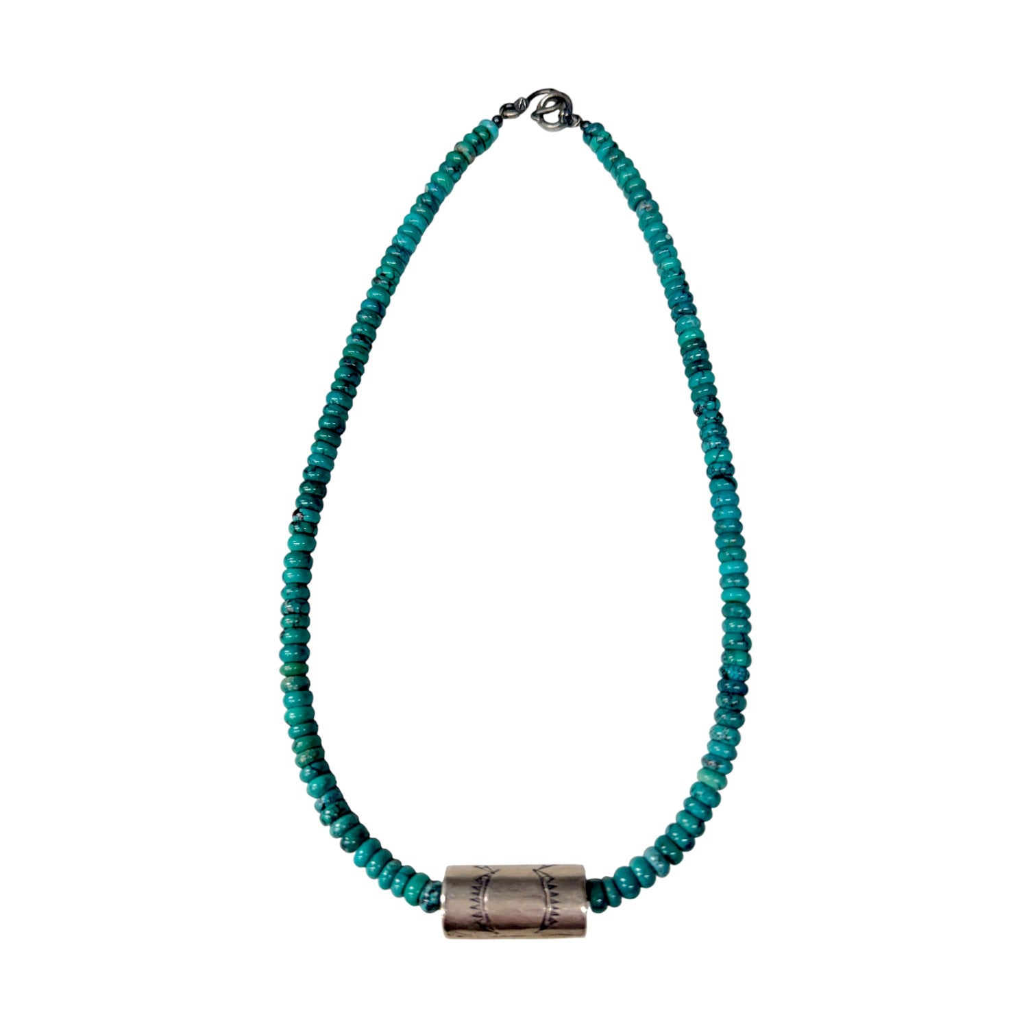 This beautiful necklace features a strand of vibrant Kingman turquoise accented by a handcrafted sterling silver barrel bead for a striking focal point. Each turquoise bead is meticulously hand-strung by a local Native artisan, reflecting generations of traditional craftsmanship and cultural artistry. The soft oxidized finish of the silver bead adds depth and contrast, enhancing the rich blue-green hues of the turquoise. Designed with a timeless Southwestern aesthetic, it drapes gracefully and complements both casual and elevated looks. Authentic, refined, and full of character, this necklace is a standout addition to any jewelry collection.