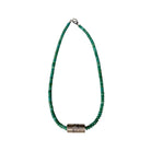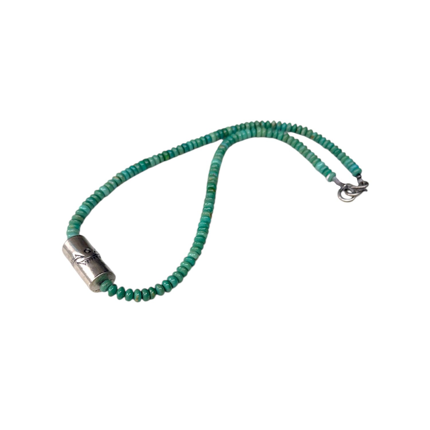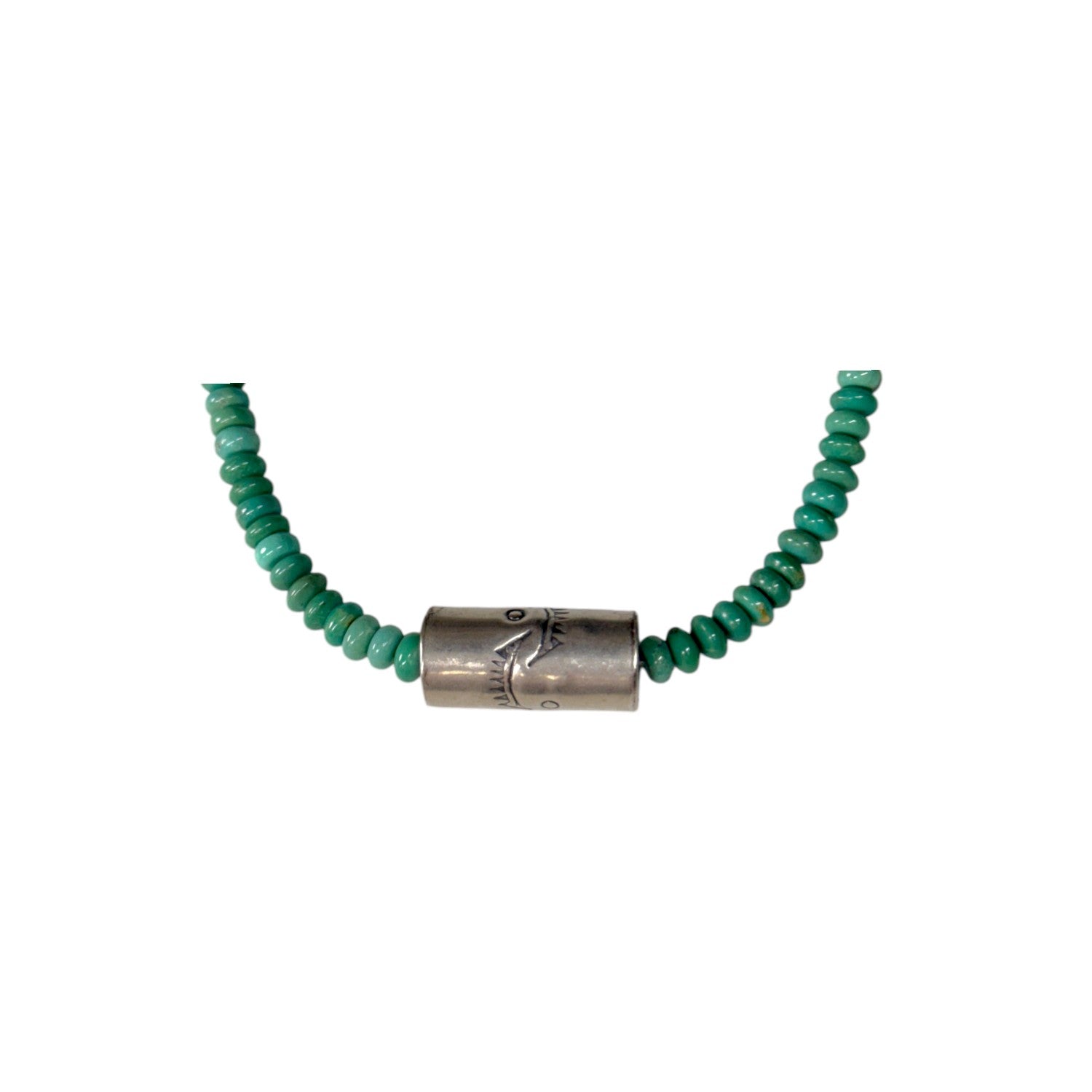 This handcrafted necklace features genuine Kingman Turquoise beads expertly strung by a Native artisan, showcasing the stone’s vibrant blue-green hues and natural matrix. The smooth, heishi-style turquoise creates a clean and balanced strand that rests comfortably along the neckline. At the center, a machine-made silver pearl barrel bead adds a subtle focal point, beautifully complementing the rich color of the turquoise. The contrast between the polished silver and organic stone gives the piece a timeless Southwestern appeal. Perfect for layering or wearing alone, this necklace offers versatile style rooted in traditional Native craftsmanship.