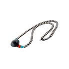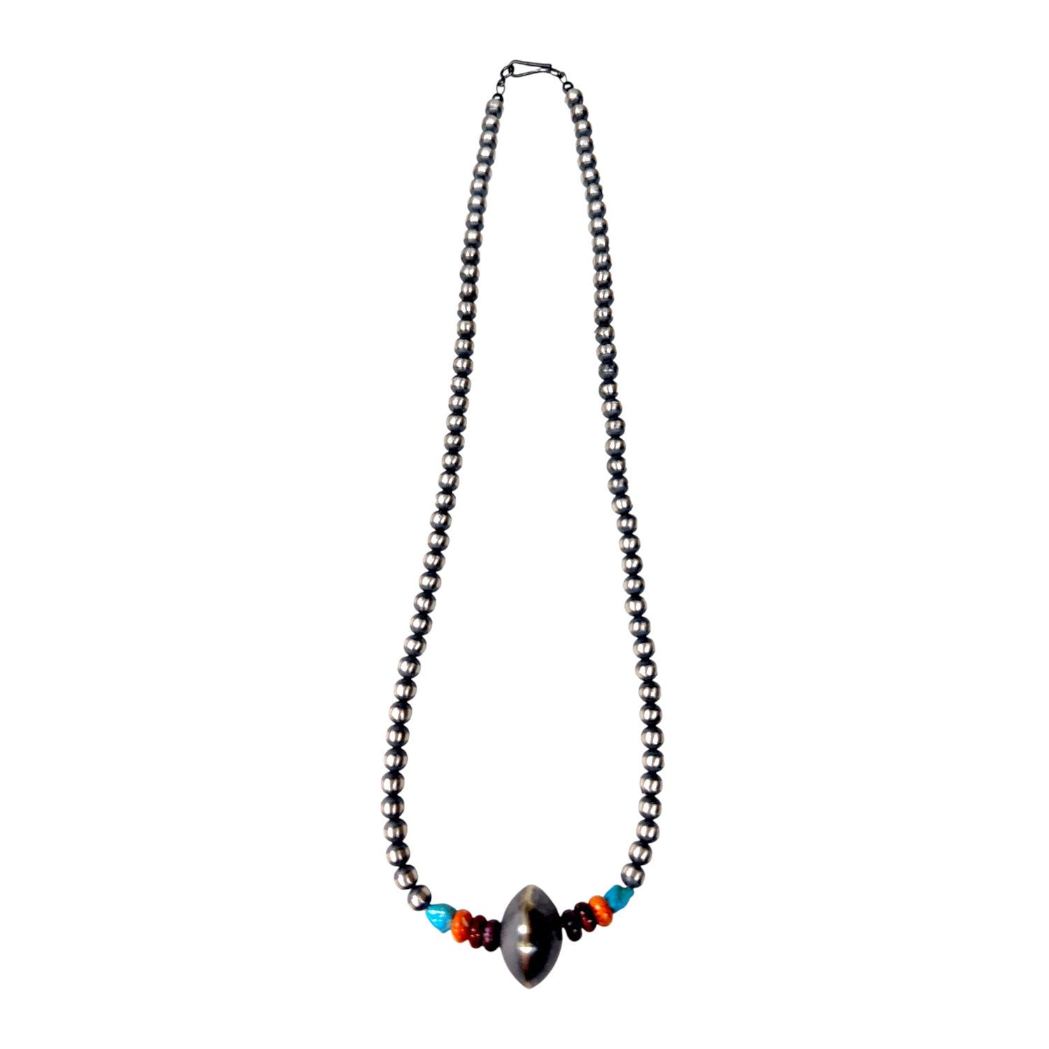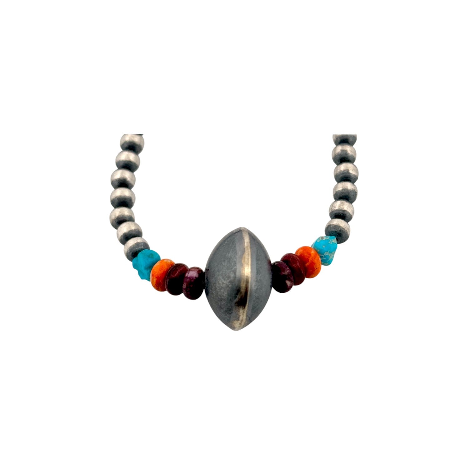 This striking necklace blends machine-made silver pearls with vibrant natural stones, creating a refined yet boldly Southwestern aesthetic. A skilled local Native artisan has hand-strung each element, balancing Kingman turquoise, red, orange, and purple Spiny Oyster shell alongside a central elongated silver bead for a beautifully weighted design. The cool shine of sterling silver enhances the rich spectrum of colors, allowing each stone to stand out while contributing to a harmonious composition. Thoughtful spacing and expert craftsmanship give the necklace a graceful rhythm, showcasing both precision and artistic intuition. Distinctive and full of character, this piece embodies the fusion of contemporary materials with time-honored Native jewelry traditions.