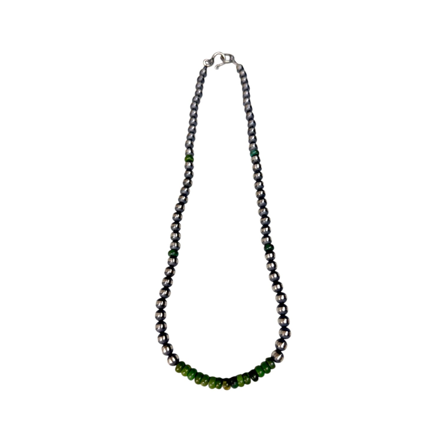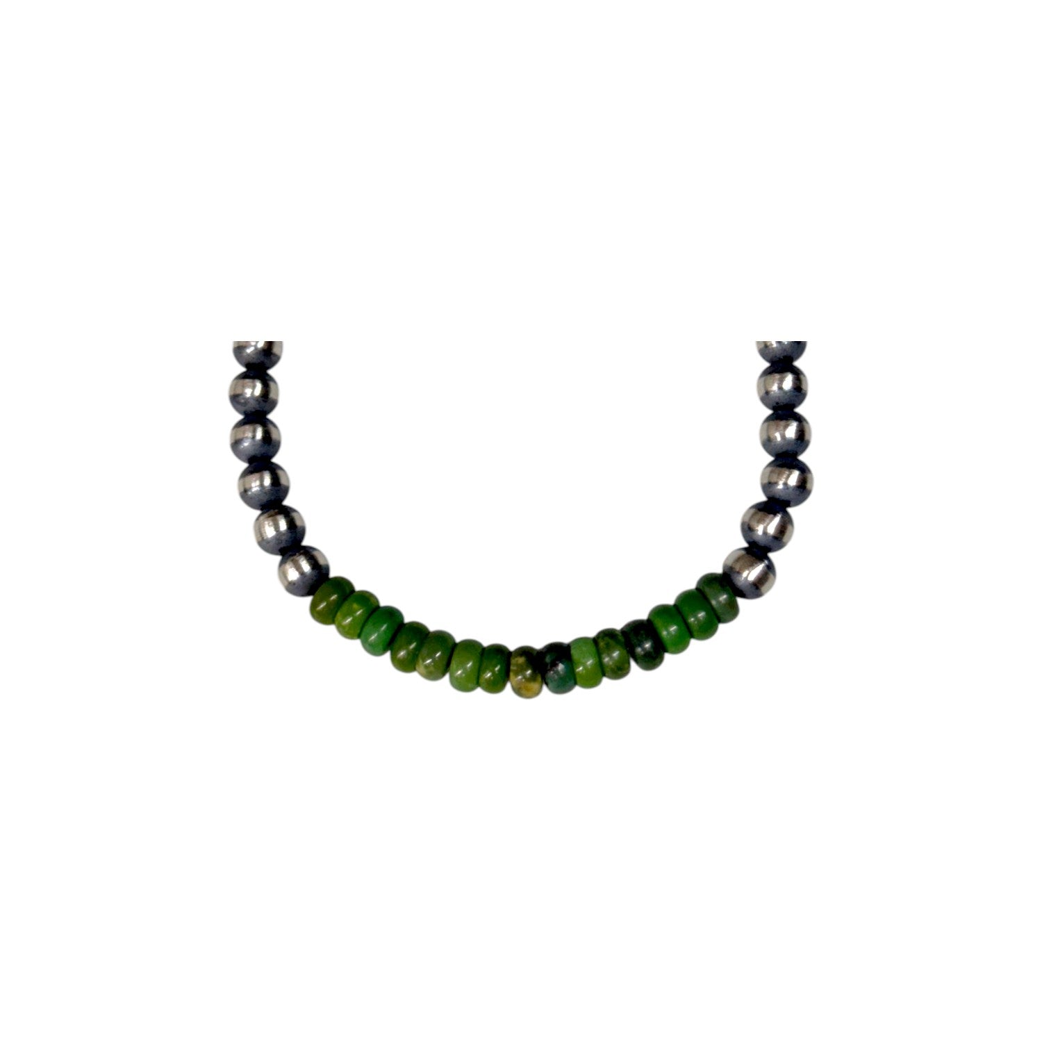 This distinctive necklace features rich Green Kingman Turquoise beads carefully strung by a Native artisan, showcasing the stone’s earthy tones and natural matrix. The vibrant green heishi-style beads form a striking centerpiece that contrasts beautifully with the cool shine of machine-made silver pearls. The alternating pattern creates a clean, balanced design that highlights both texture and color. Subtle variations in the turquoise lend authenticity and organic character to the strand. Perfect for layering or wearing alone, this necklace offers timeless Southwestern style with a fresh, modern edge.