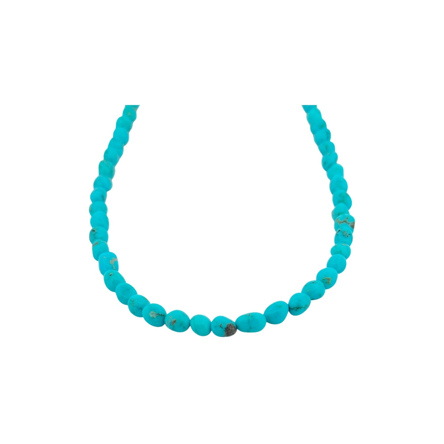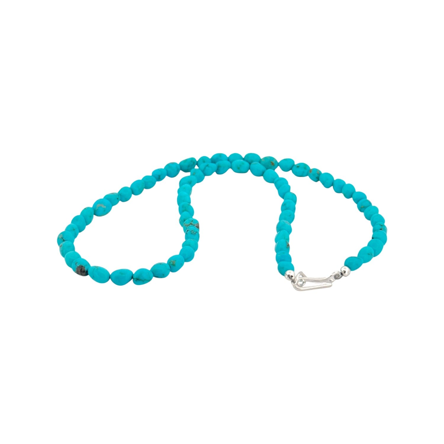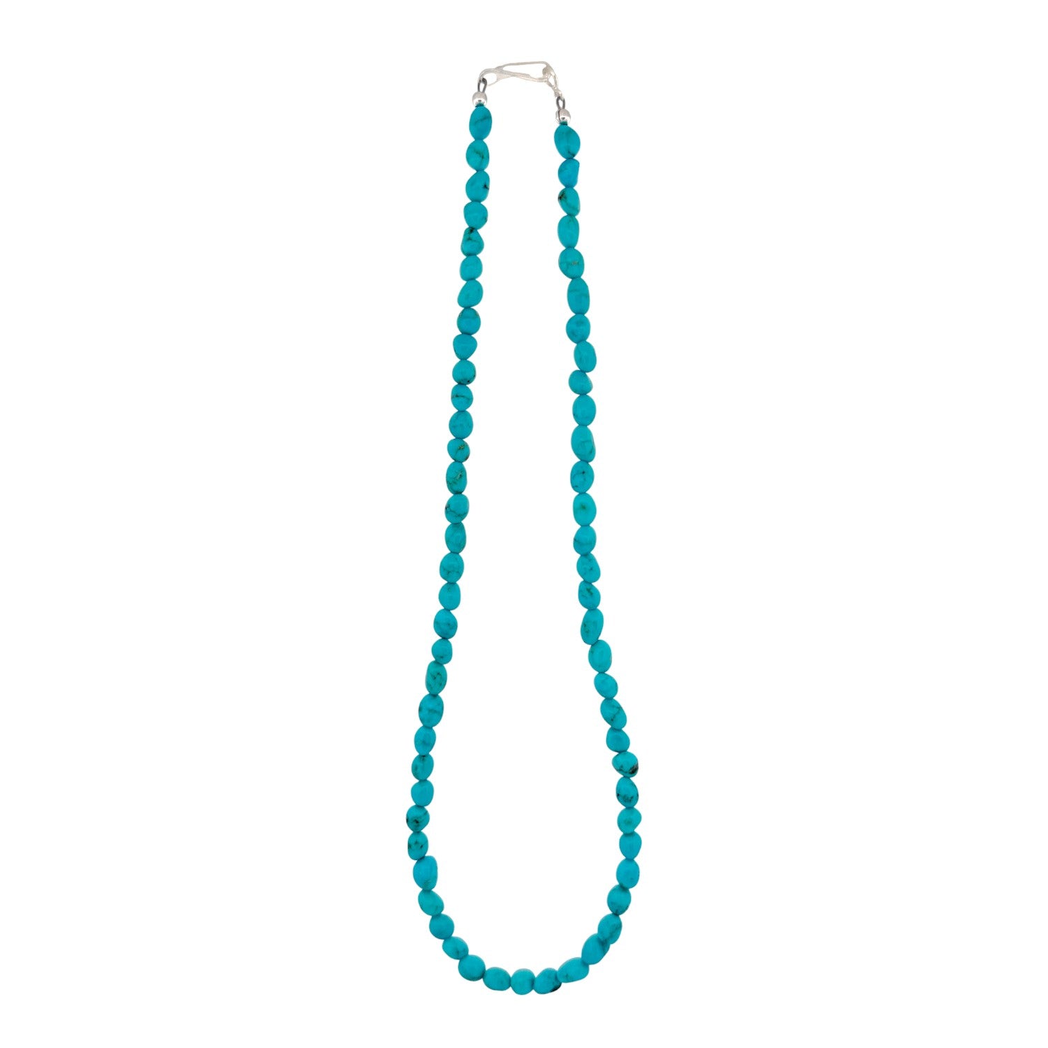 This elegant necklace features machine-made sterling silver pearls beautifully accented with vibrant Kingman Turquoise stones. Each bead is expertly hand-strung by a local Native artisan, showcasing exceptional craftsmanship and cultural pride. The polished silver enhances the vivid blue of the turquoise, creating a timeless Southwestern design. Versatile and graceful, it complements both casual and formal attire. A stunning expression of Native artistry and enduring elegance.