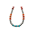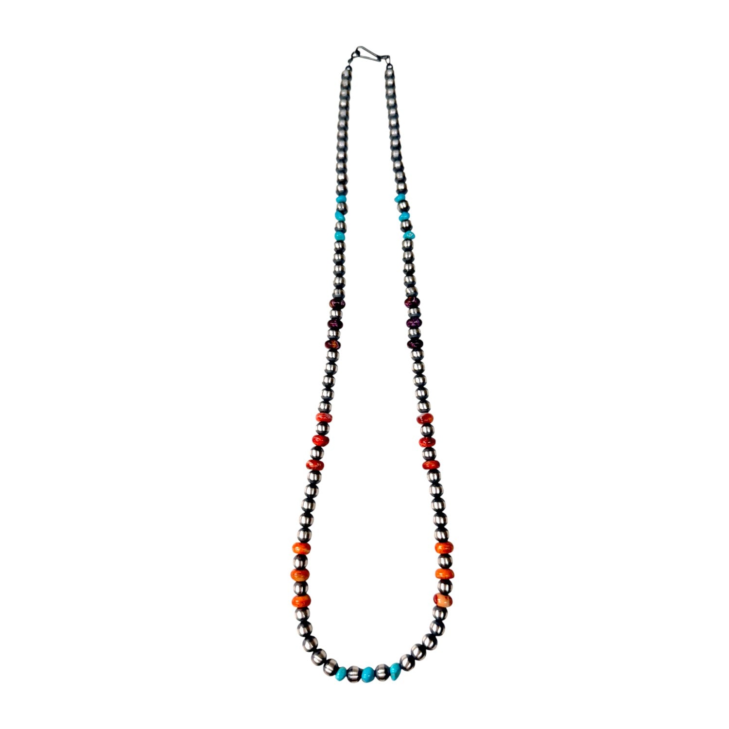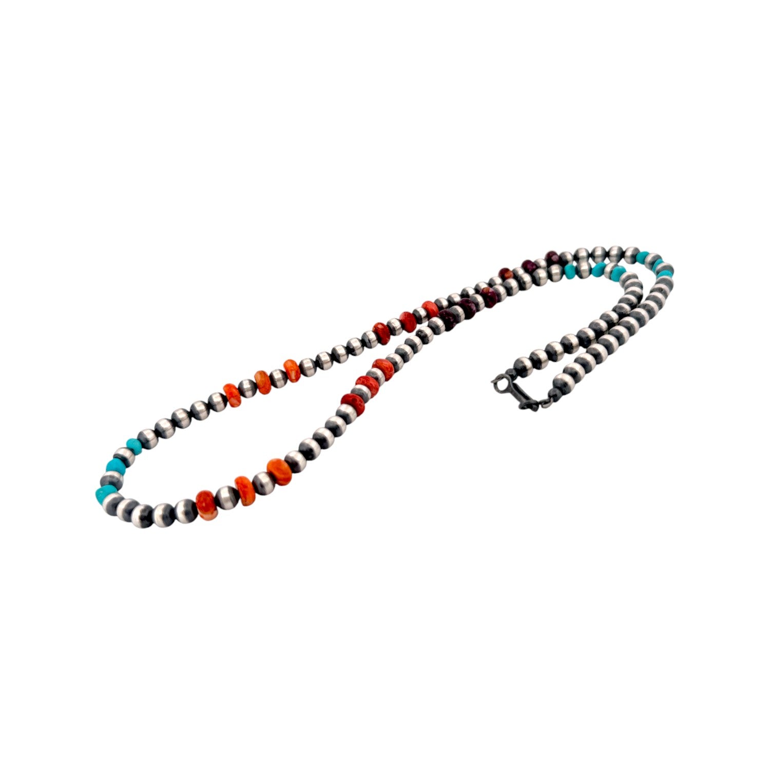 This eye-catching necklace combines the smooth elegance of machine-made silver pearls with the vibrant natural colors of Kingman turquoise and multi-hued Spiny Oyster shell. Hand-strung by a skilled local Native artisan, the piece showcases a harmonious balance of cool silver tones and warm, earthy reds, oranges, and purples. Each bead is thoughtfully placed, allowing the turquoise and shell accents to create a rhythmic burst of color throughout the refined silver strand. Sterling silver components further elevate the design, adding durability and a polished finish that speaks to quality craftsmanship. Effortlessly blending tradition with contemporary style, this necklace embodies the rich artistic heritage of Native-made jewelry.