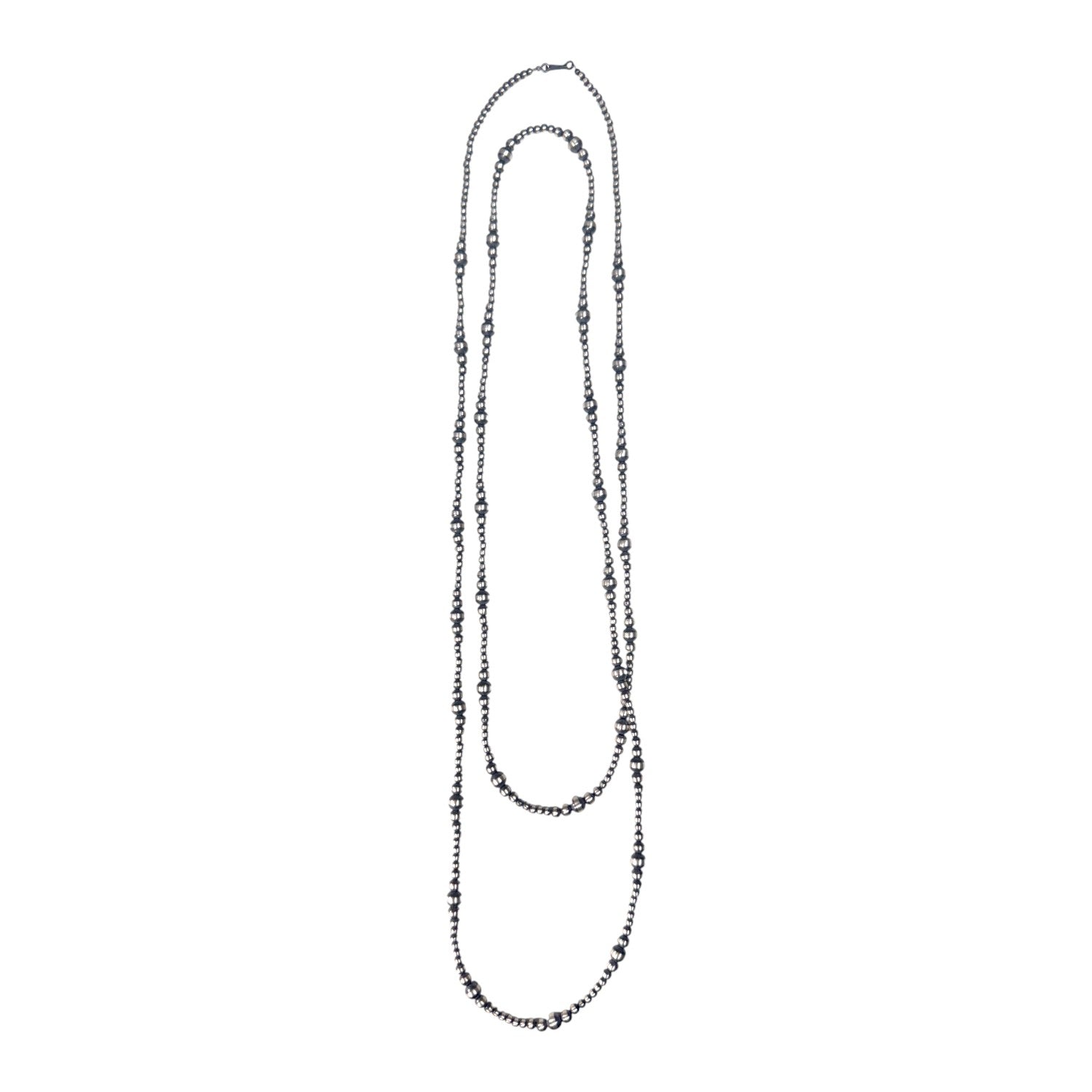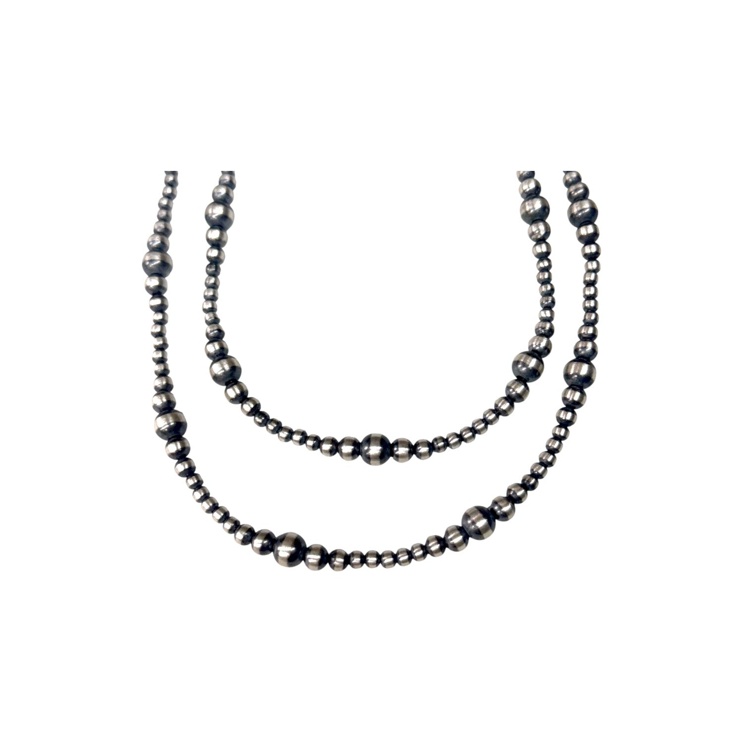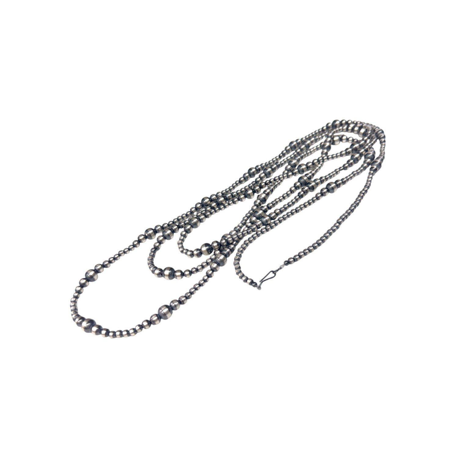 This elegant necklace features machine-made silver pearls arranged along a long, graceful strand for a timeless Southwestern look. Hand-strung by a local Native artisan, it reflects careful craftsmanship and meaningful cultural artistry. The oxidized silver tone adds depth and character, giving the piece a versatile style that pairs beautifully with both modern and traditional jewelry. Sterling silver findings ensure lasting durability and a high-quality finish. Designed for layering or standalone wear, this necklace adds understated sophistication to any collection.