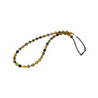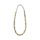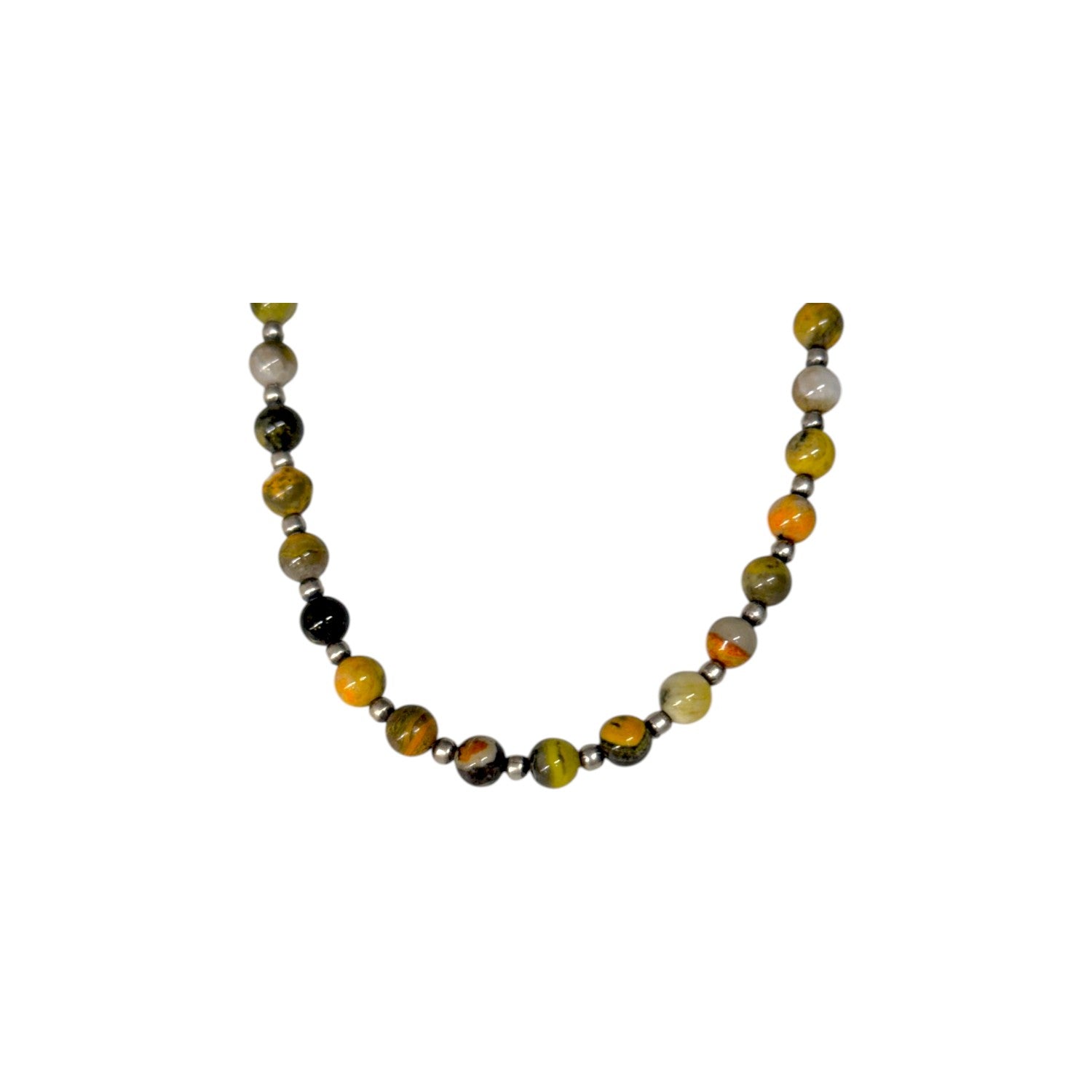 This eye-catching necklace features vibrant Bumblebee Jasper beads skillfully strung by a Native artisan, showcasing the stone’s striking bands of golden yellow, orange, cream, and black. The natural variation in each bead creates a lively, organic pattern full of warmth and character. Polished machine-made silver pearls are thoughtfully placed throughout the strand, adding balance and a subtle metallic shine. The contrast between the bold jasper tones and the smooth silver accents gives the piece a distinctive Southwestern appeal. Perfect for adding a pop of color to any look, this necklace blends natural beauty with timeless Native-inspired design.