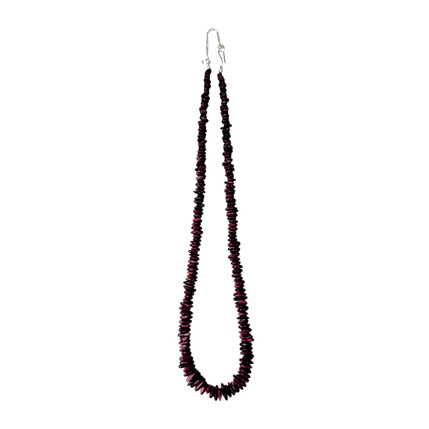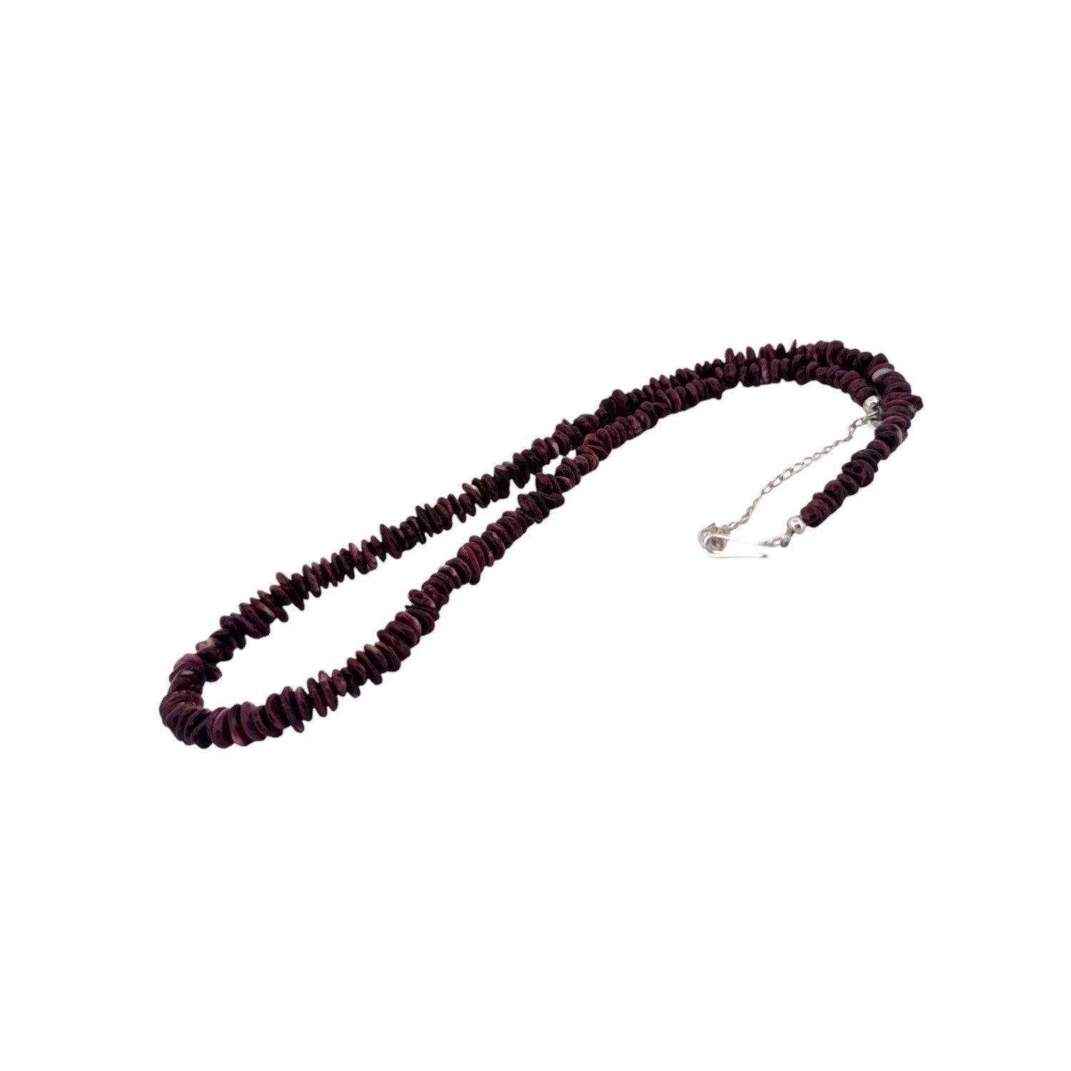 This striking necklace showcases richly hued purple Spiny Oyster shell, each bead expertly shaped and hand-strung by a skilled local Native artisan. Its deep, natural coloration reflects generations of traditional craftsmanship, honoring the vibrant materials long treasured in Southwestern artistry. Sterling silver findings add a refined touch, elevating the necklace with a subtle shine that complements the shell’s organic luster. Every bead carries its own character, creating a rhythm and texture that speaks to the artisan’s careful eye and steady hand. Elegant yet full of heritage, this piece embodies the timeless beauty of Native-made jewelry.