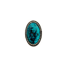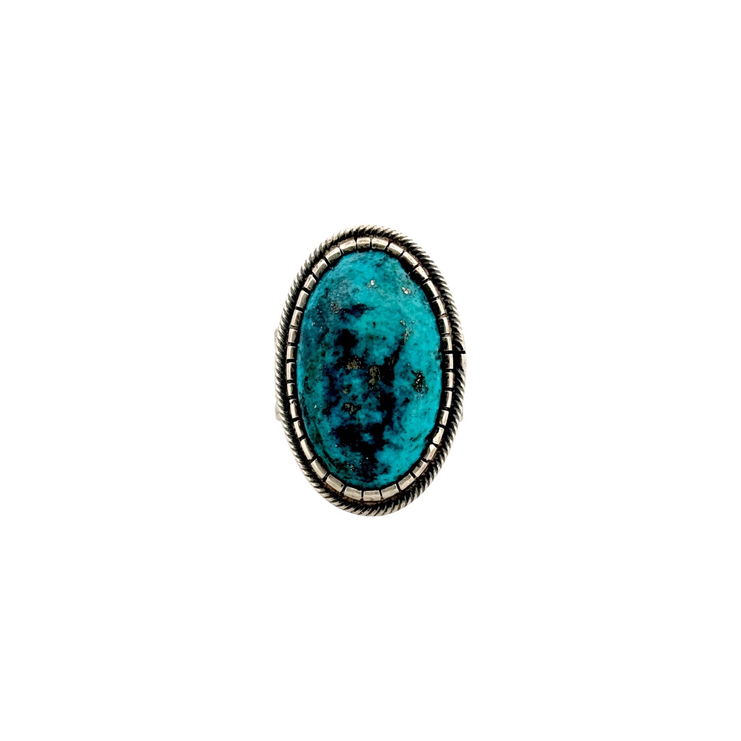 This Navajo handmade ring by Cody Noble features a bold Persian turquoise stone with rich blue tones and a striking dark matrix. The large oval cabochon is set in polished sterling silver, framed by clean, traditional bezel work that highlights the stone’s natural beauty. Subtle stamp detailing along the edges adds depth and classic Navajo character. The wide silver band provides a comfortable and balanced fit, complementing the strong presence of the stone. Elegant and timeless, this ring showcases Noble’s refined craftsmanship and the enduring appeal of Persian turquoise.