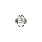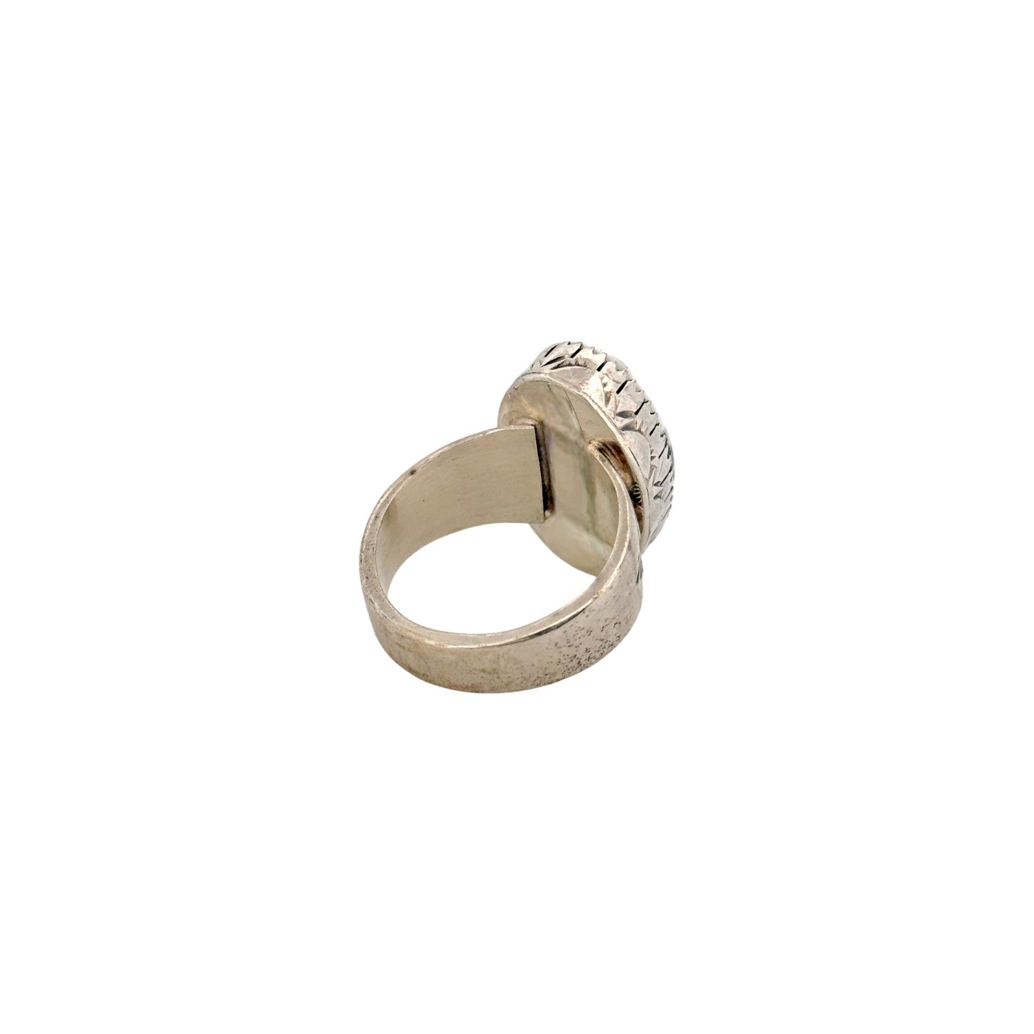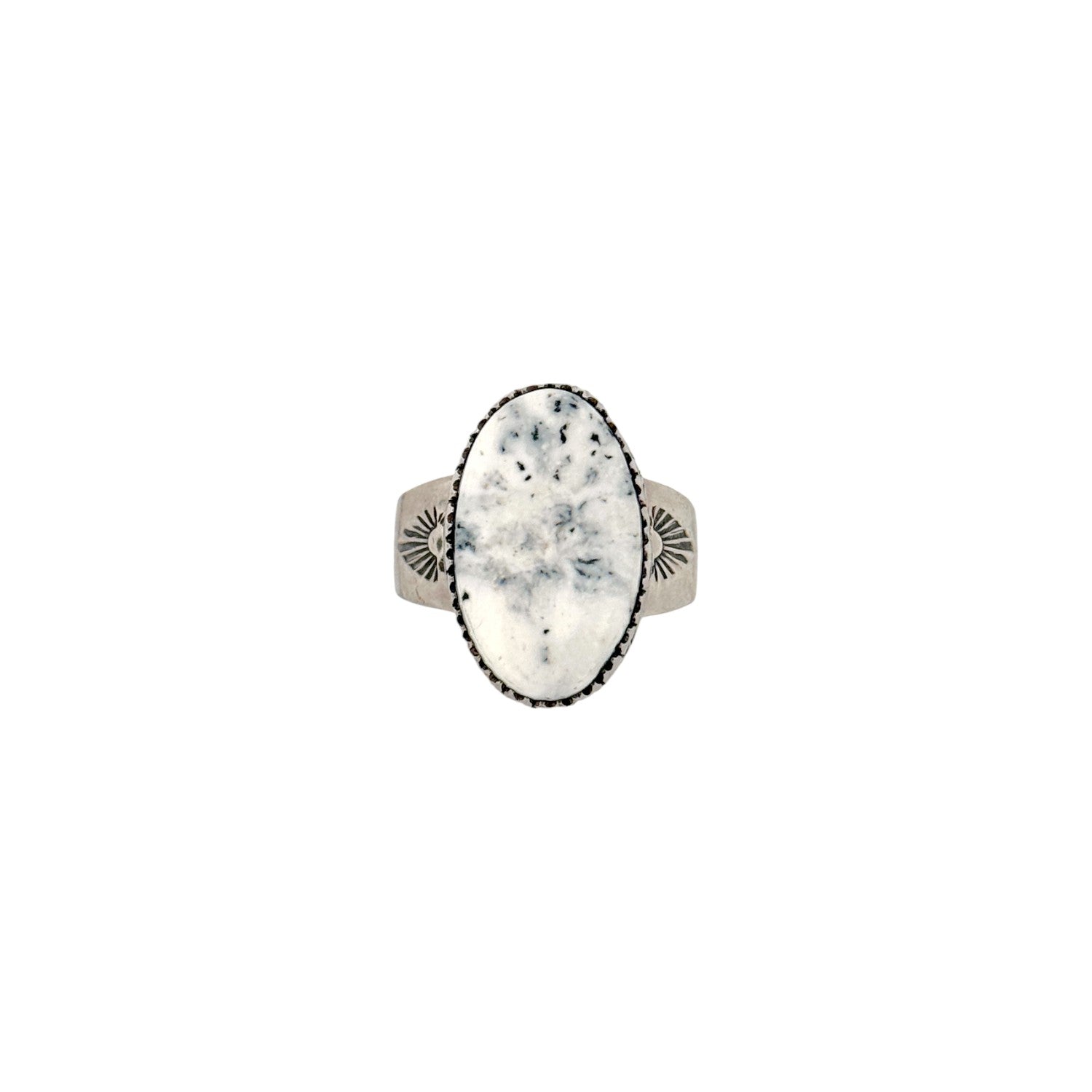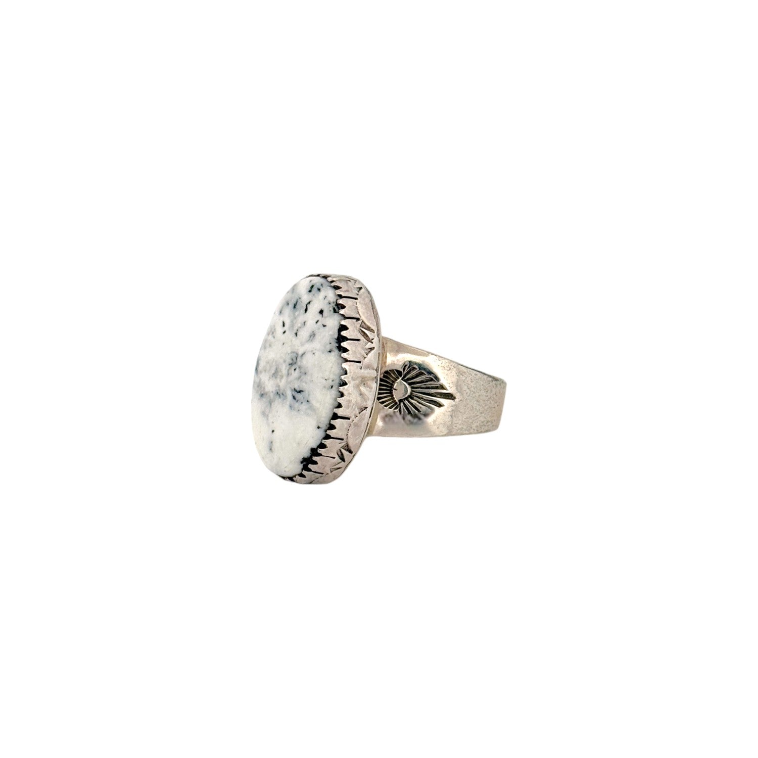 This Wilson Padilla ring features a striking White Buffalo Turquoise stone, admired for its bold contrast of crisp white and natural black matrix. The elongated oval stone is set in a finely crafted sterling silver bezel with delicate sawtooth edging. Hand-stamped designs on the band highlight Padilla’s traditional Navajo silversmithing techniques. The clean, monochrome palette gives the piece a modern yet timeless elegance. This Navajo handmade ring is a distinctive statement accessory that showcases the rare beauty of White Buffalo Turquoise.