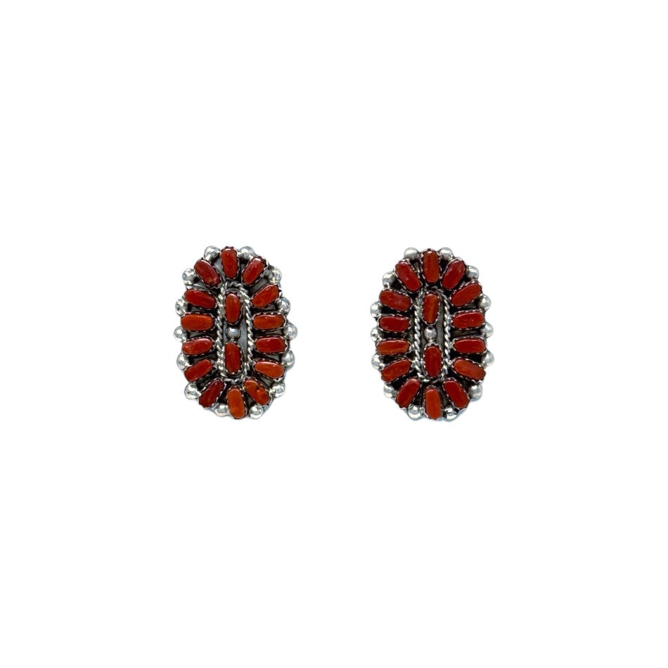 These exquisite earrings by Jean Paisano feature a classic Zuni cluster design crafted from vibrant coral and shimmering sterling silver. Each earring is formed in a bold oval shape, inlaid with a radiating pattern of meticulously hand cut coral stones. The warm red hues of the coral contrast beautifully against the cool silver, creating an eye catching balance of color and craftsmanship. Framed with delicate silver beading, the earrings display Jean Paisano's refined attention to detail and traditional Zuni silversmithing techniques. Their compact, symmetrical form makes them versatile for both daily wear and special occasions.