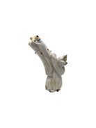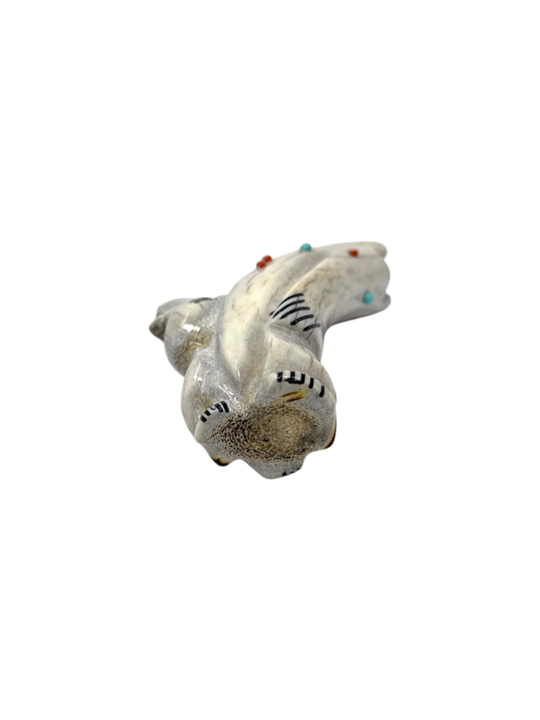 This delightful Dancing Bears fetish by renowned Zuni artist Claudia Peina captures joy in motion with heartwarming artistry. Hand carved from natural antler, the mother bear and cub are shown mid-dance, their poses and facial expressions radiating playfulness and familial love. Tiny stones of turquoise and coral are skillfully set across their bodies, representing adornment and spiritual significance. Each detail from the etched fur and expressive paws to the soft polish of the antler reflects Peina’s meticulous craftsmanship and whimsical storytelling. In Zuni tradition, bears symbolize strength, healing, and protection, while this particular scene also celebrates maternal care and harmony.
