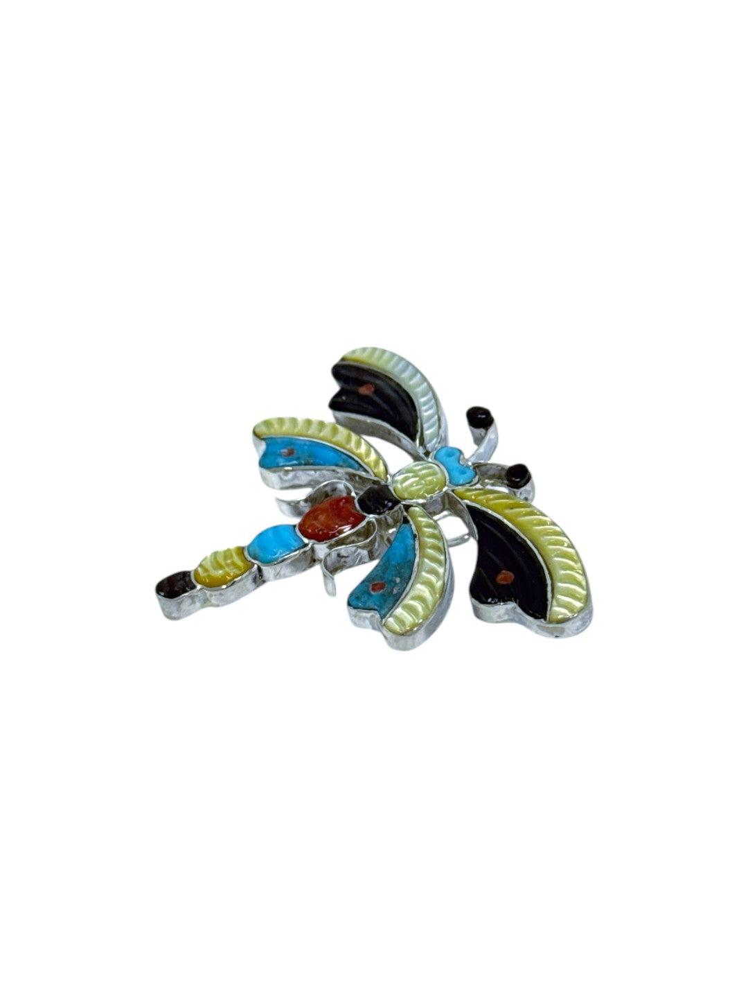 An exquisite pin and pendant by Tamara Pinto are a stunning representation of a dragonfly, handcrafted with care in Zuni tradition. The elegant silhouette is brought to life through vibrant multi-stone inlay, including turquoise, jet, coral, yellow shell, and brown shell, creating a vivid, lifelike composition. Each stone is finely cut and meticulously set in sterling silver, showcasing exceptional skill and artistry. The wings of the dragonfly are beautifully curved and detailed with natural color contrast, symbolizing transformation and lightness of being. The segmented body features a symmetrical arrangement of stones, emphasizing the creature’s natural beauty and spiritual significance in Native American culture. This piece is designed to be worn as either a pin or pendant, offering versatile elegance.