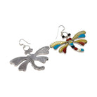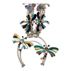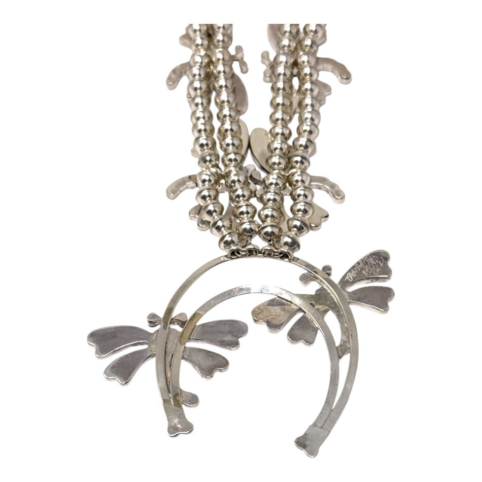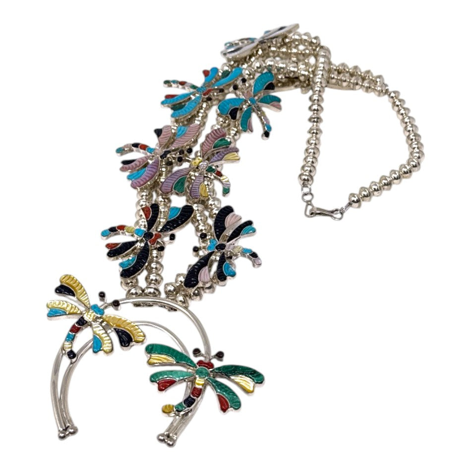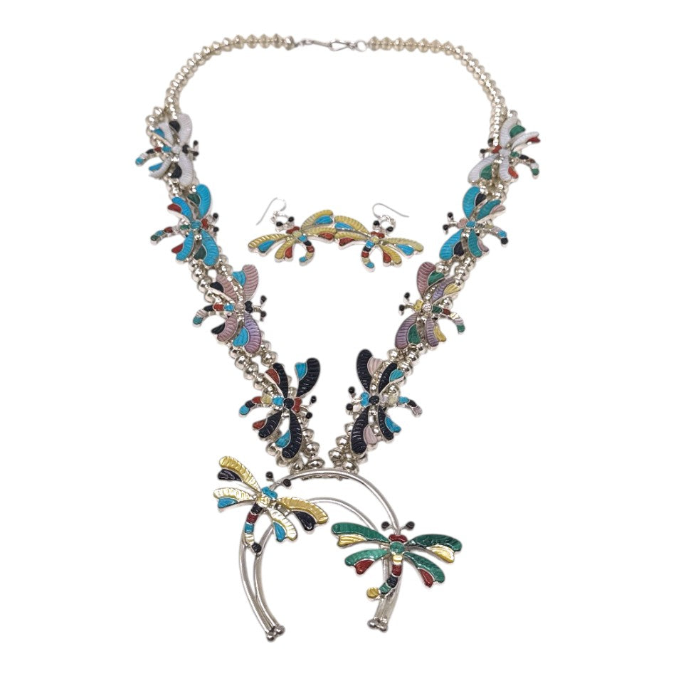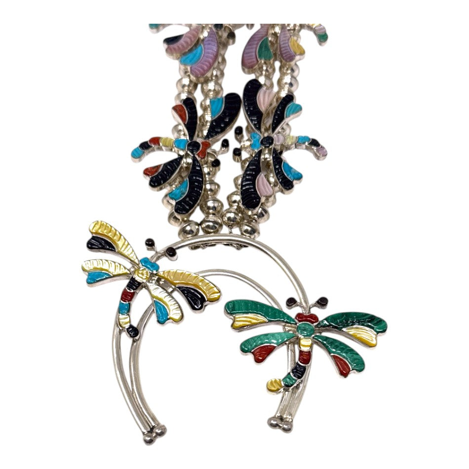 This vibrant necklace and earring set by Tamara Pinto is a breathtaking example of Zuni handmade craftsmanship, featuring an intricate multi-stone inlay design set in sterling silver. The set showcases colorful dragonfly motifs, brought to life with stones such as turquoise, coral, jet, shell, and mother of pearl. Each piece is carefully inlaid with a high level of precision, resulting in an elegant mosaic of color and motion. The necklace is beautifully structured with a central naja flanked by inlaid dragonflies that gracefully cascade up the sides. Matching earrings mirror the whimsical dragonfly design, creating a cohesive and lively aesthetic. The shimmering silver beads of the necklace enhance the vivid colors of the stones, making it an unforgettable statement piece.