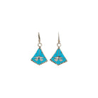 These Zuni handmade earrings by Diana Quam feature luminous Sleeping Beauty turquoise paired beautifully with iridescent mother of pearl inlays. The triangular silhouette is accented with a delicate dragonfly design, symbolizing transformation and harmony in nature. Clean sterling silver channel work creates crisp lines that highlight the vivid blue turquoise and the soft glow of the shell. A subtle beaded edge along the base adds texture and refined detail. Lightweight and artfully balanced, this pair reflects the precision and storytelling tradition of Zuni inlay craftsmanship.