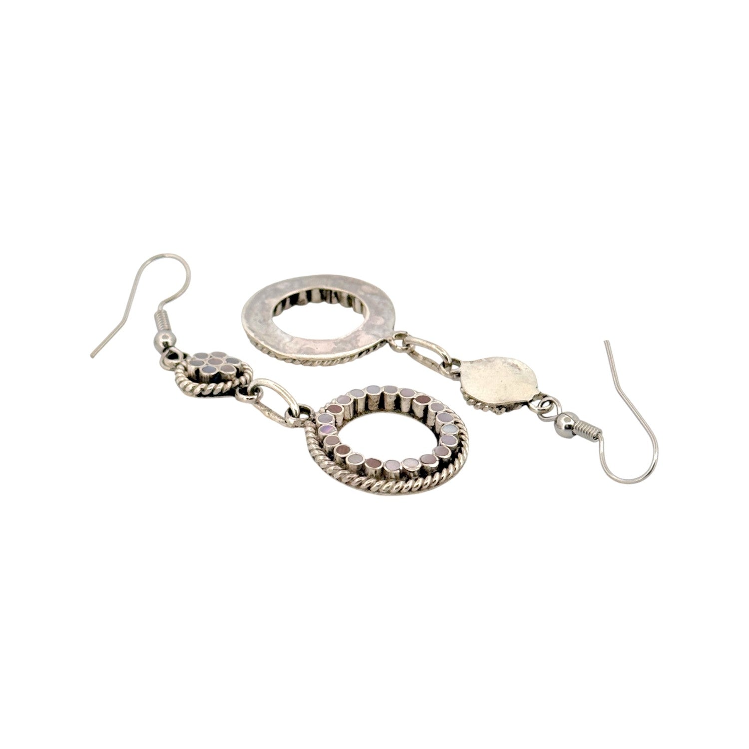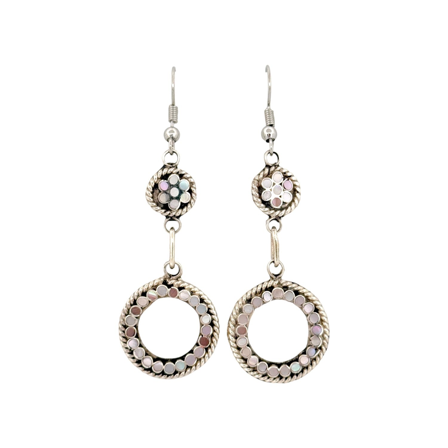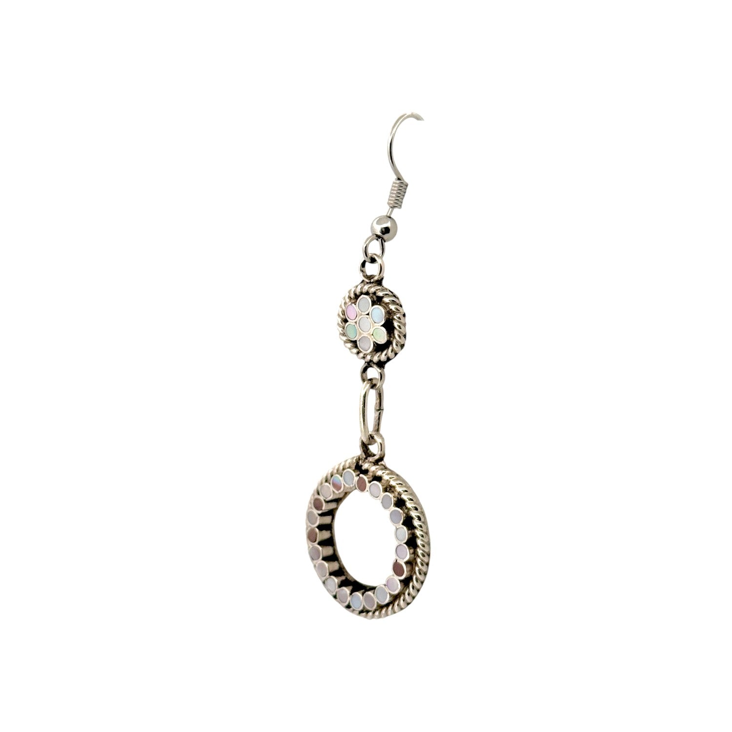 These delicate earrings by Zuni artist Devin Quam beautifully showcase the refined artistry of traditional Zuni inlay work. Each earring features shimmering Mother of Pearl stones arranged in intricate circular and floral patterns, set in polished sterling silver with twisted rope accents. The soft iridescent tones of the shell reflect hues of white, pink, and lavender, creating a graceful and luminous effect. Quam’s precise craftsmanship and attention to symmetry highlight the hallmark of Zuni jewelry; balance, beauty, and meaning in every detail. The double-circle drop design adds elegant movement and a touch of sophistication to any look.