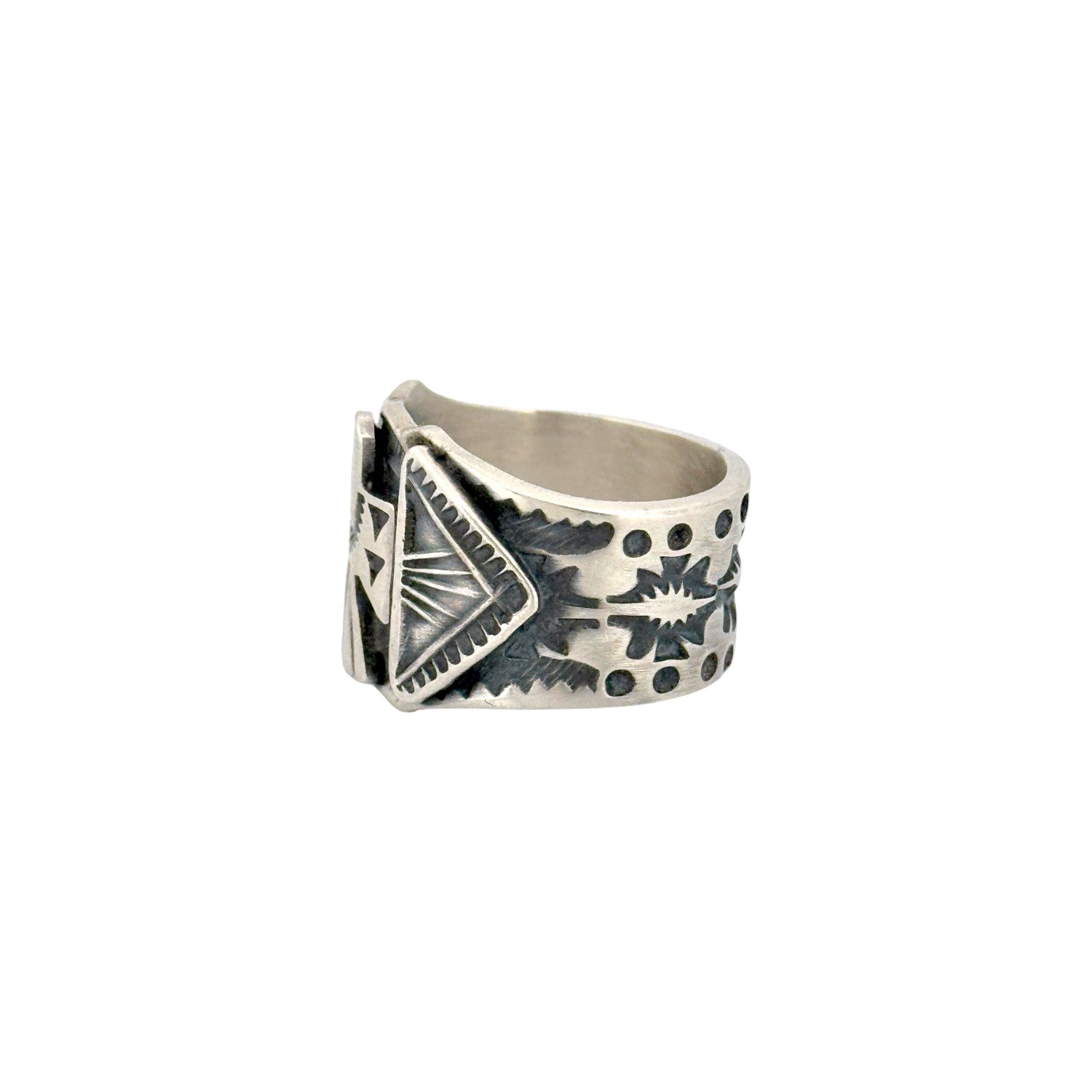 This handcrafted sterling silver ring by Navajo silversmith Bo Reeves embodies strength and tradition through its bold design. The centerpiece features a beautifully stamped Thunderbird; an enduring symbol of power, protection, and spiritual connection in Native culture. Flanking the Thunderbird are finely detailed sunray patterns, representing life, energy, and renewal. Reeves’ expert silverwork combines precision stamping with a rich oxidized finish, creating striking contrast and depth. The wide band gives the piece a strong, masculine presence while maintaining a refined, balanced form.