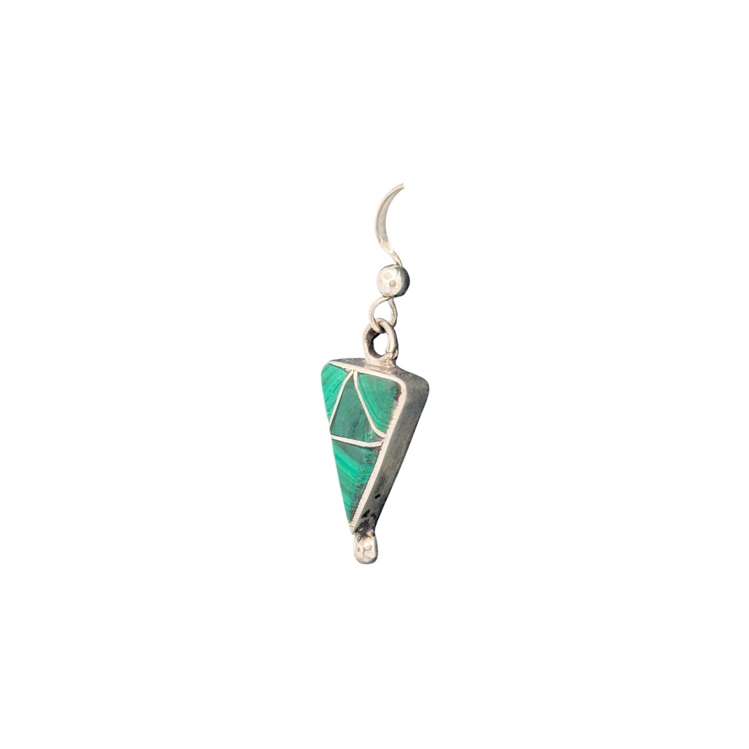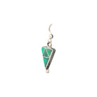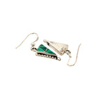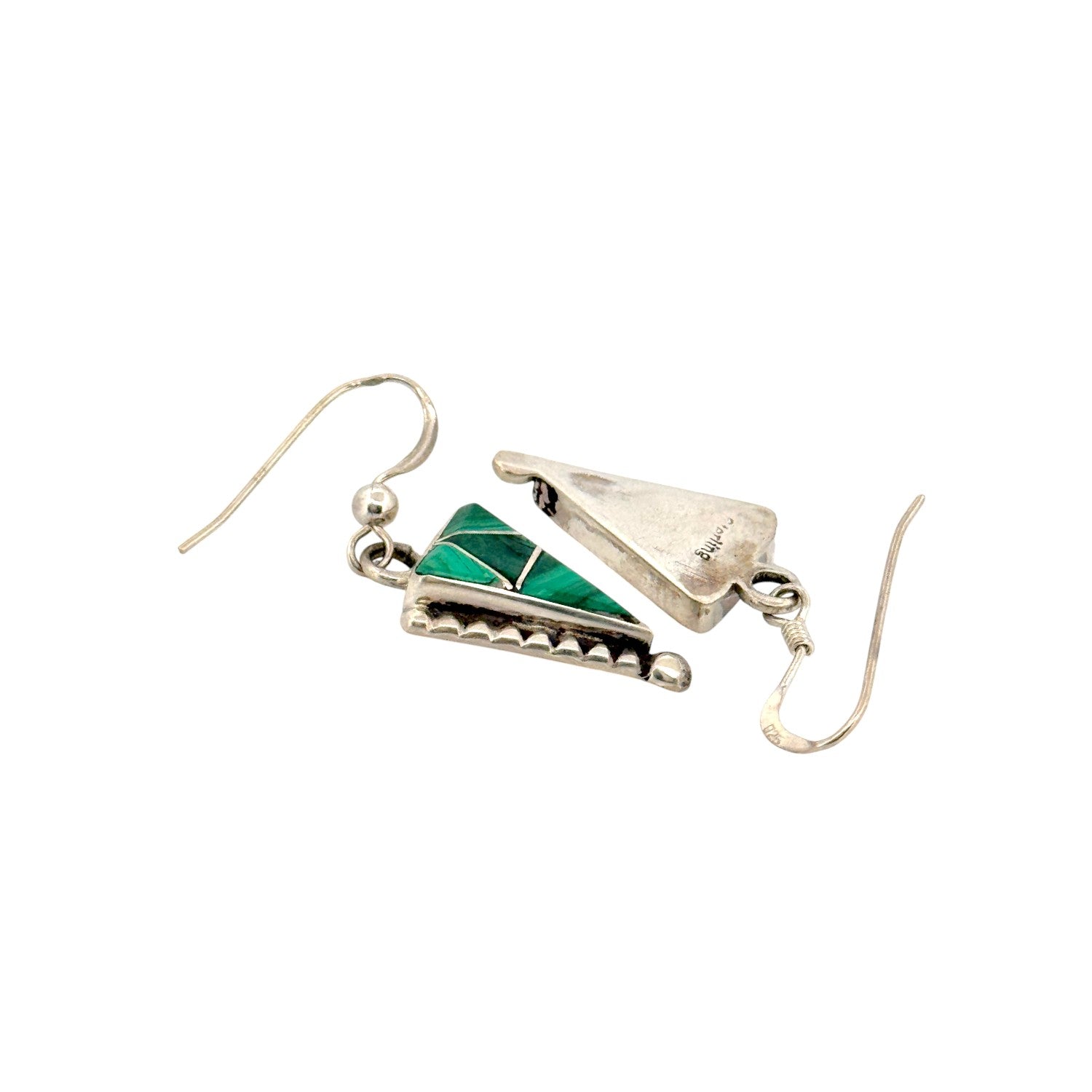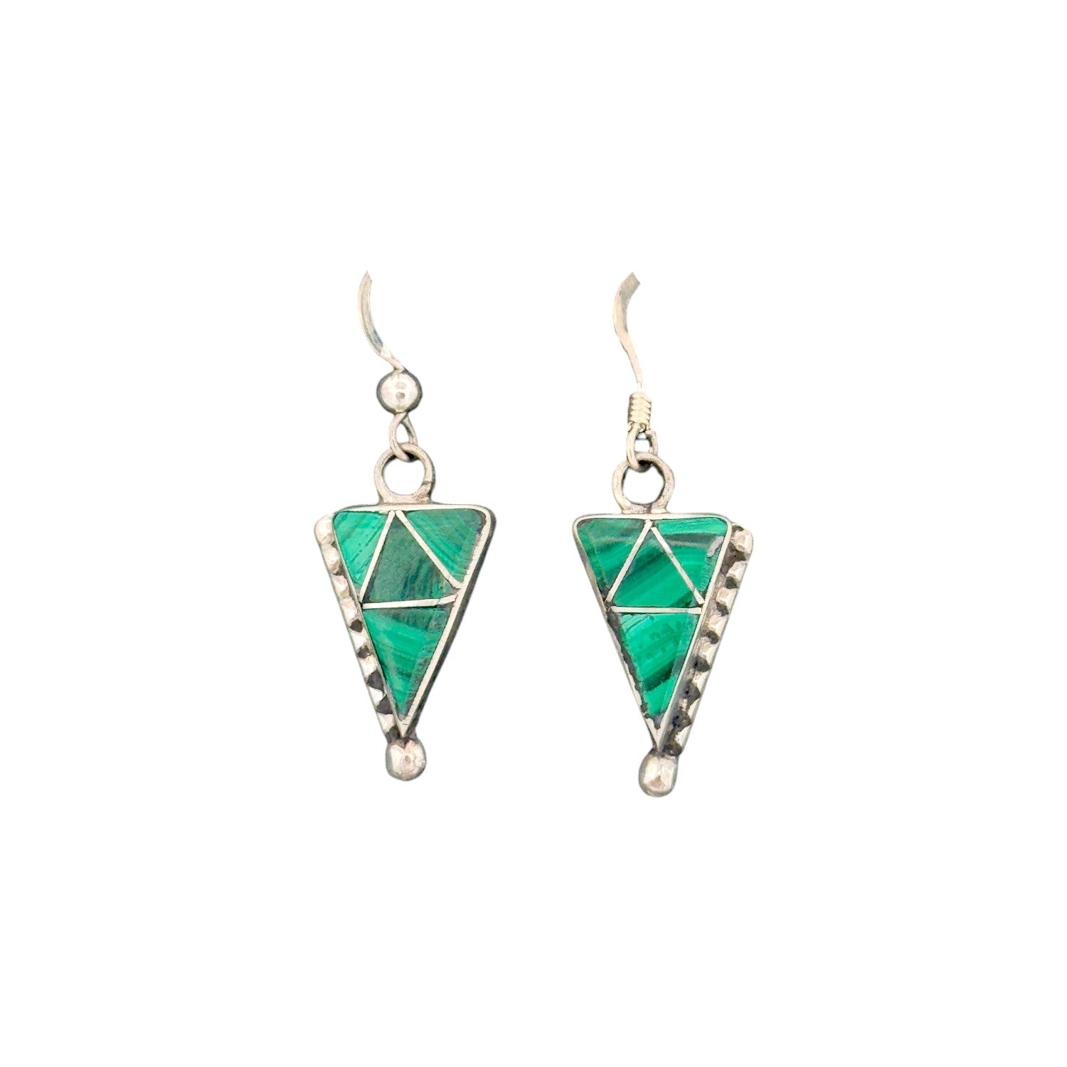 These beautiful earrings by Zuni artist Eldrick Seoutewa feature the vibrant green tones of Malachite, masterfully inlaid into a geometric triangular design. The natural banding of the malachite creates a stunning visual texture, complemented by the clean lines of sterling silver channels that divide each section with precision. A row of hand-stamped silver detailing runs along the edge, adding subtle depth and dimension. The earrings are lightweight yet striking, hanging gracefully from simple silver hooks for easy wear. Every element reflects the refined craftsmanship and symmetry that define traditional Zuni inlay jewelry.