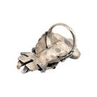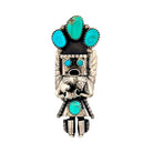 Doris Smallcanyon ring is a striking example of cultural artistry, featuring a detailed Kachina figure design in sterling silver. The piece is adorned with Kingman Turquoise stones, including three at the headdress, two for the eyes, and one at the center of the figure’s body. Each stone is set in finely crafted bezels, adding vibrant blue highlights to the bold silverwork. Intricate stamp work and hand-carved details bring the kachina to life, emphasizing its symbolic and spiritual significance. The oxidized background enhances the depth of the design, creating contrast between the polished silver and turquoise. With its sculptural quality and powerful presence, this ring carries both artistic value and cultural heritage.