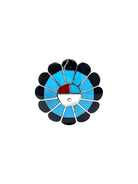 This striking ring by Federick & Denise Suitza exemplifies the exceptional artistry of Zuni handmade jewelry, crafted in sterling silver and meticulously inlaid with multi-stone materials. The design radiates around a sun face motif, symbolizing harmony and balance, a sacred theme in Zuni culture. The face is crafted using turquoise, jet, coral, and mother of pearl, seamlessly inlaid to create a powerful and unified expression. Surrounding the central face are alternating petal-like shapes in turquoise and jet, forming a stylized flower with bold color contrast and symmetry. Each stone is individually shaped and set, showcasing the precision and craftsmanship for which the Suitzas are known.