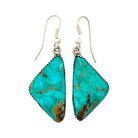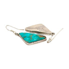 These Navajo handmade earrings by Griffin & Vangie Tsabetsaye feature striking Water web Kingman turquoise, known for its vivid blue-green hues and intricate matrix patterns. Each stone is cut into a bold geometric shape, giving the earrings a contemporary edge while honoring traditional Navajo silversmithing. The cabochons are set in serrated sterling silver bezels, providing both security and a textured frame that enhances the natural beauty of the turquoise. The earthy brown and golden webbing within the stones adds depth and character, making each earring one-of-a-kind. Finished with sterling silver French hooks, they offer both comfort and movement when worn. The Tsabetsaye's are celebrated for their high-quality craftsmanship and creative stone selections, and these earrings embody their artistry beautifully.