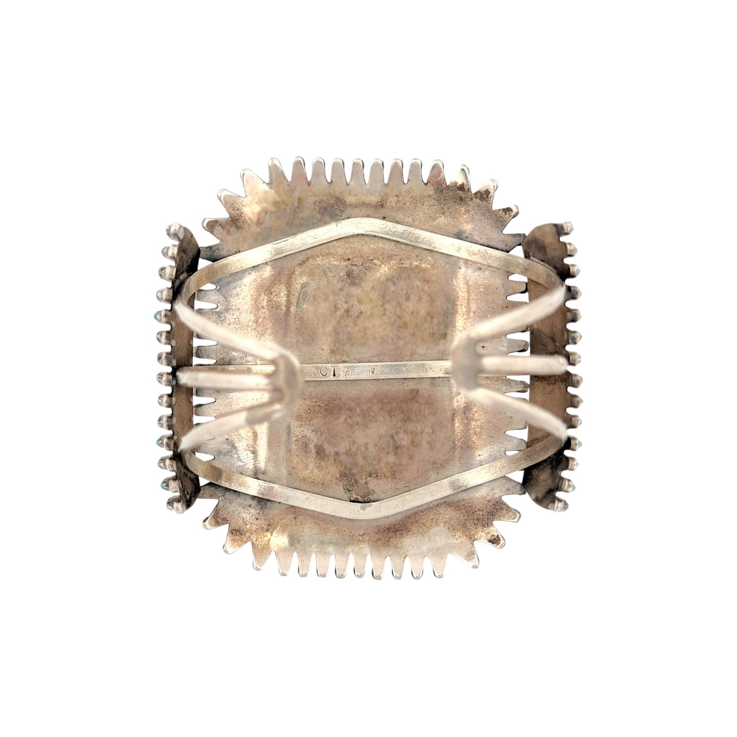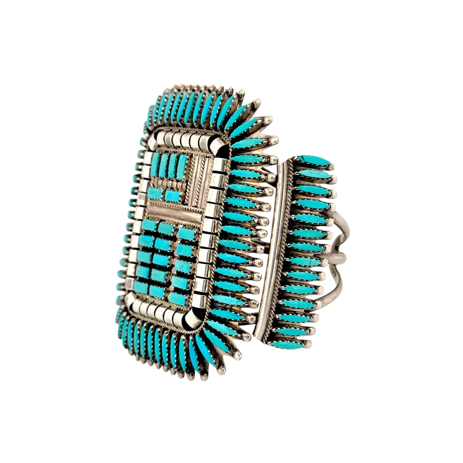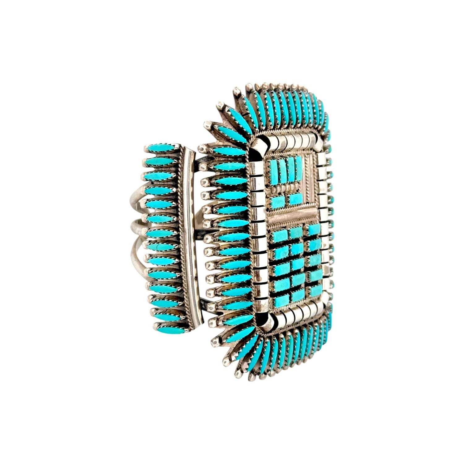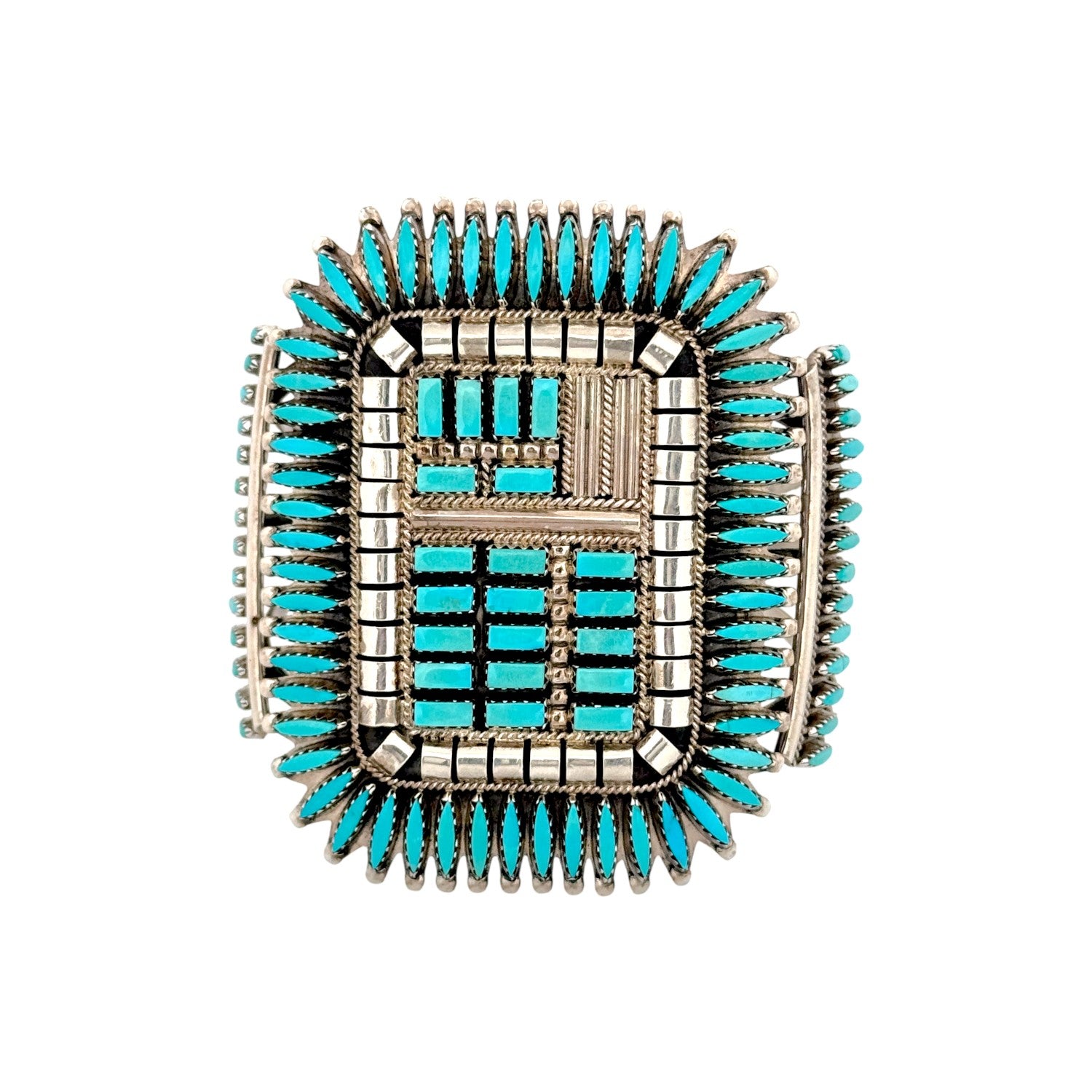 This Christopher Tsosie bracelet showcases the exceptional artistry of Zuni handmade jewelry. It features meticulously set Sleeping Beauty turquoise stones, each hand-cut and arranged with striking precision. The stones are framed in gleaming sterling silver, highlighting Tsosie’s mastery of intricate cluster and channel-style design work. The bold geometric layout creates a visually powerful composition that reflects both tradition and innovation.
