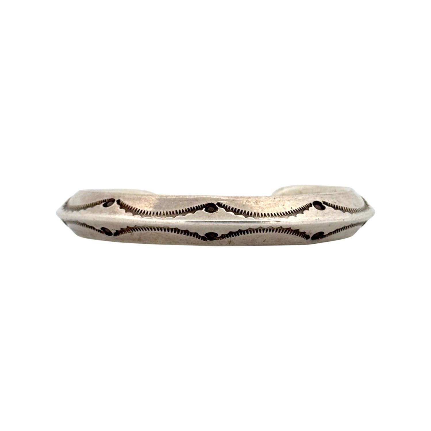 This vintage Navajo bracelet from the 1990s is a refined example of traditional silverwork. Handcrafted from sterling silver, the cuff features delicately stamped designs that flow in repeating patterns along its surface, creating a balanced and rhythmic look. The stamping is highlighted with subtle oxidization, enhancing the depth and detail of the design. Its rounded, slightly domed form gives the bracelet a smooth, comfortable fit while maintaining a solid and durable feel. The understated elegance of this piece makes it versatile, suitable for both everyday wear and layering with other jewelry. Its natural patina adds character and authenticity, reflecting its age and handmade origin.