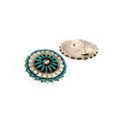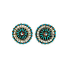 These vintage Zuni handmade earrings from the 1980s are a stunning example of traditional cluster inlay work. Crafted in sterling silver, each circular earring features a radiant sunburst design made from Sleeping Beauty turquoise, abalone shell, jet, and coral. The fine inlay work forms a vibrant mosaic, with the center showcasing the classic Zuni sun face symbol. Surrounding the sun face, alternating patterns of turquoise and abalone create a dynamic play of color and light. The use of jet and coral adds striking contrast, enhancing the intricate details of the design. With their bold circular shape and vibrant hues, these earrings embody the artistry and cultural symbolism of Zuni jewelry. Both collectible and wearable, they reflect the precision and creativity that make 1980s Zuni pieces highly sought after.