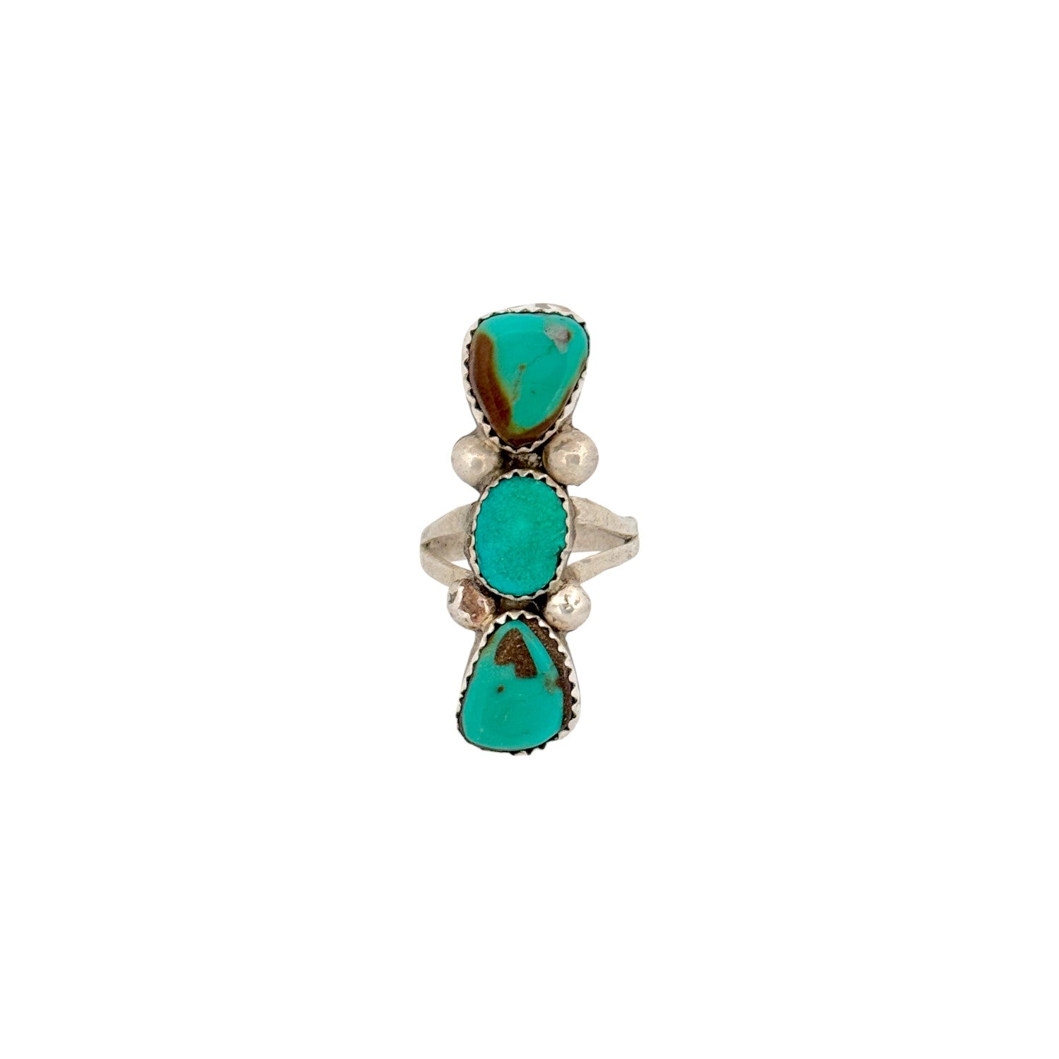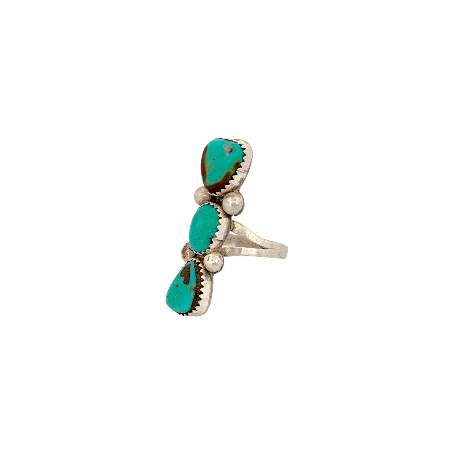 This vintage 1990's Navajo ring features three vibrant Kingman turquoise stones arranged in a vertical cascade. Each stone displays its own unique matrix and is set in a hand-cut sterling silver bezel. Silver drops accent the stones, adding balance and dimension to the elongated design. The split-shank band provides a comfortable fit while showcasing traditional Navajo silversmithing. This handmade piece captures the timeless beauty of Kingman turquoise paired with classic Southwestern craftsmanship.
