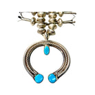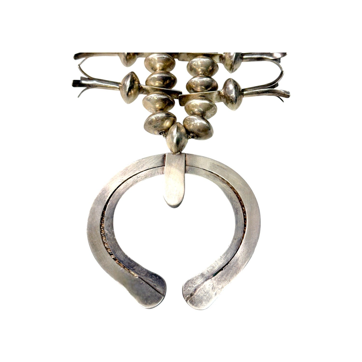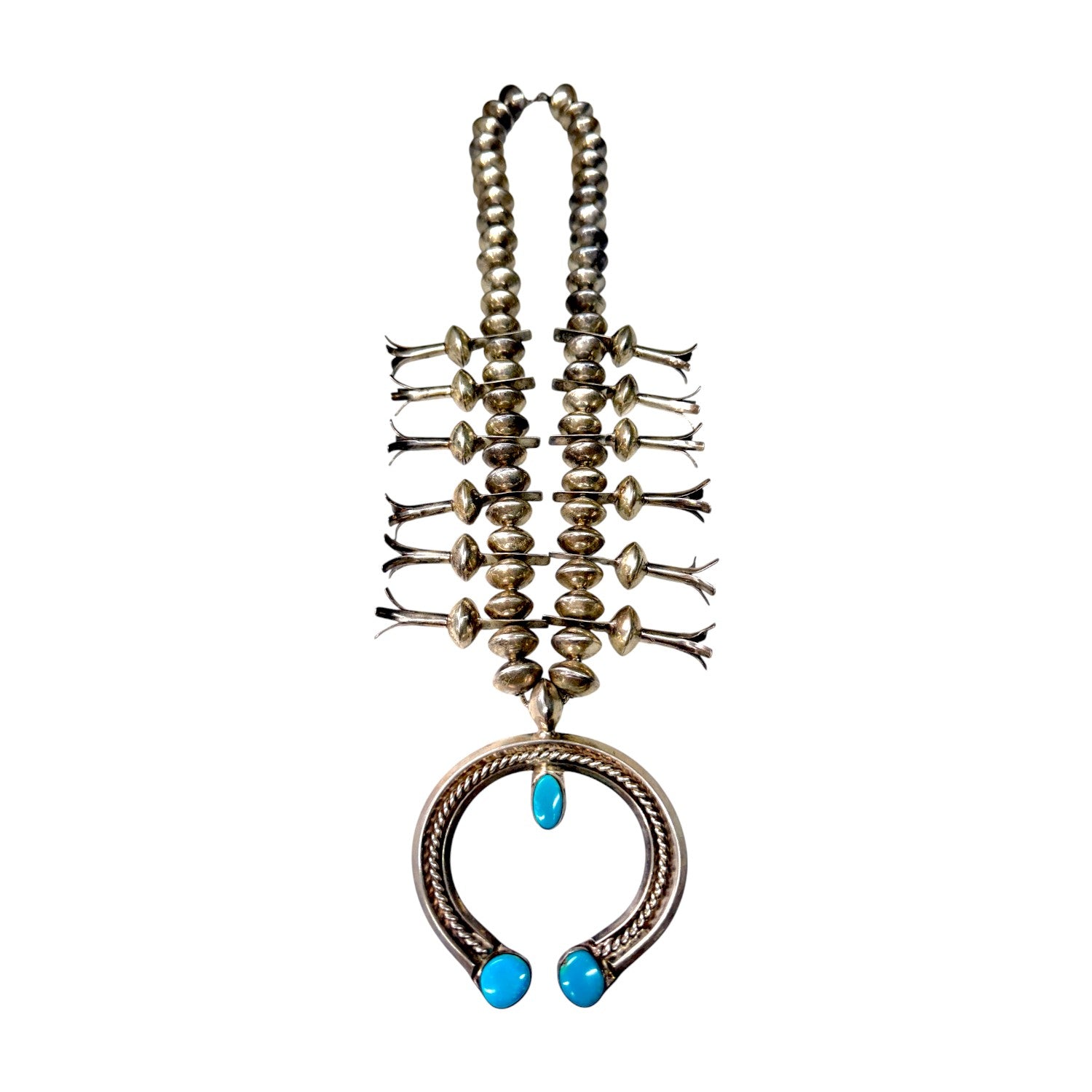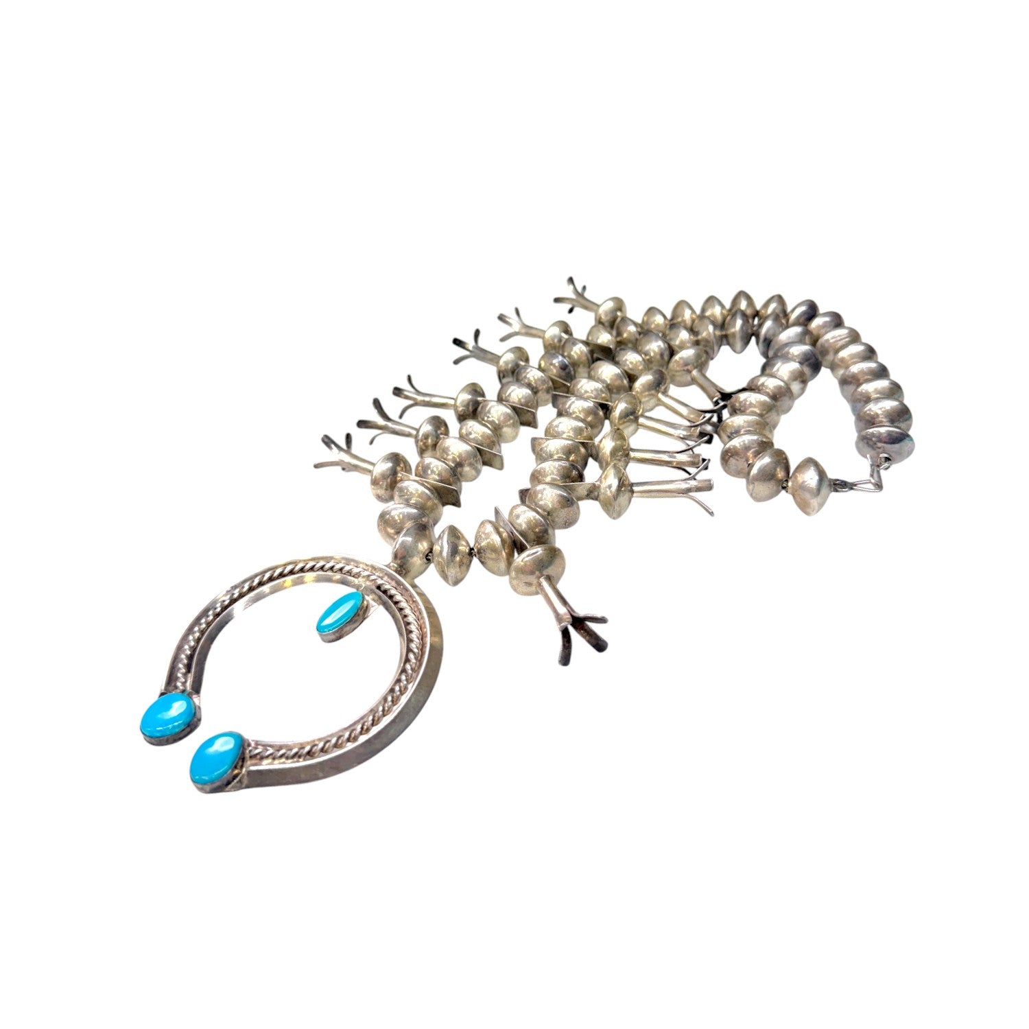 This vintage Navajo handmade necklace, dating to the early 2000s, showcases classic Southwestern craftsmanship with its traditional Kingman Turquoise stones and sterling silver construction. The necklace features hand-strung silver beads leading to multiple squash blossom elements, each formed with flared silver petals that reflect traditional Navajo silversmithing. At its center hangs a bold Naja pendant, adorned with three vibrant Kingman Turquoise stones that highlight the mine’s signature sky-blue color. Soft patina across the silver adds character, emphasizing the necklace’s age and authentic handmade origin. Elegant, historic, and culturally significant, this piece stands as a timeless example of Navajo jewelry tradition.