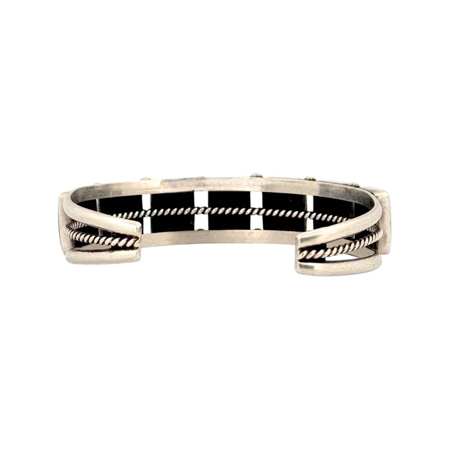 This vintage Navajo bracelet from the 1990s highlights the timeless beauty of Turquoise set in sterling silver. The cuff features a row of rectangular Turquoise stones, each with a vibrant blue-green hue that radiates natural character and charm. Set in clean silver bezels and accented with subtle silver drops, the design balances bold geometry with handcrafted detail. The bracelet’s split-shank construction ensures both durability and comfort, making it ideal for everyday wear or special occasions. With its symmetrical arrangement and vintage patina, the piece carries a sense of history and authenticity. Each stone is slightly unique, reflecting the individuality of handcrafted Native jewelry.