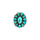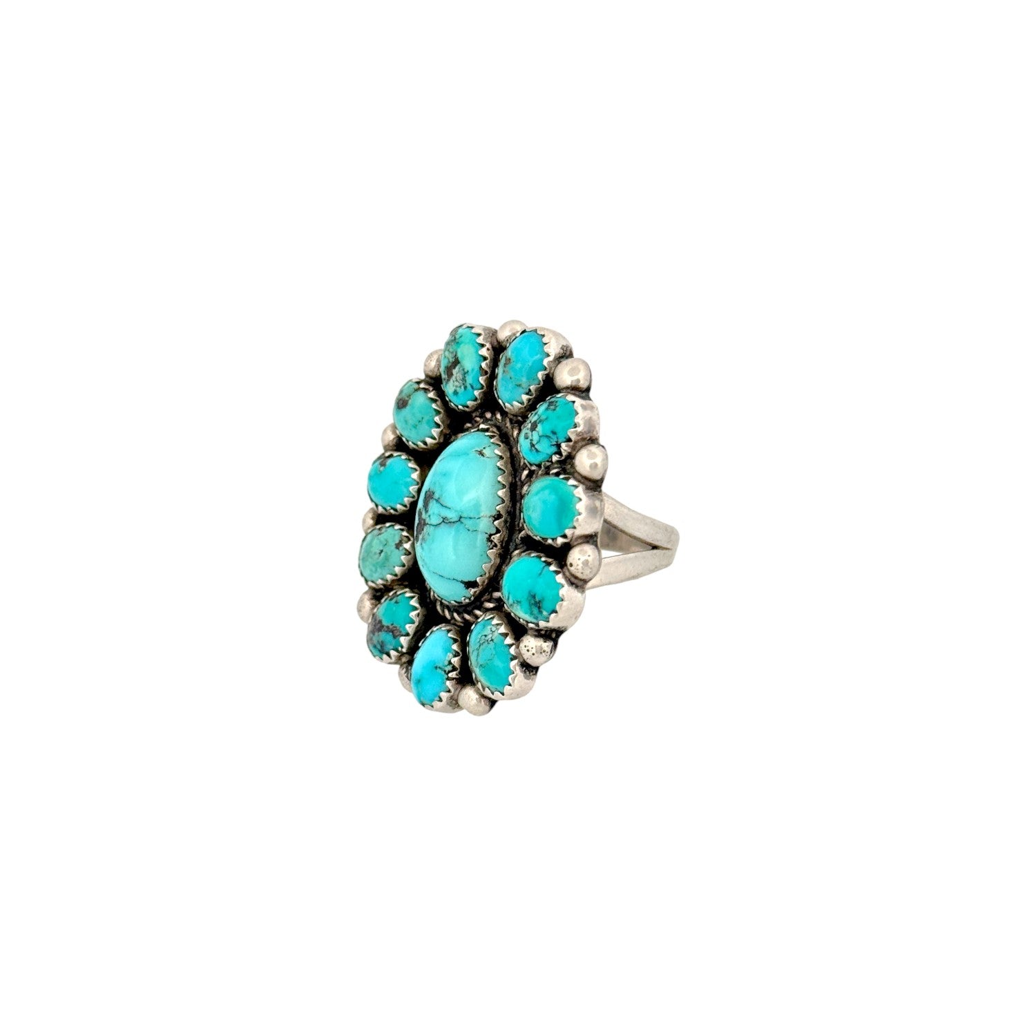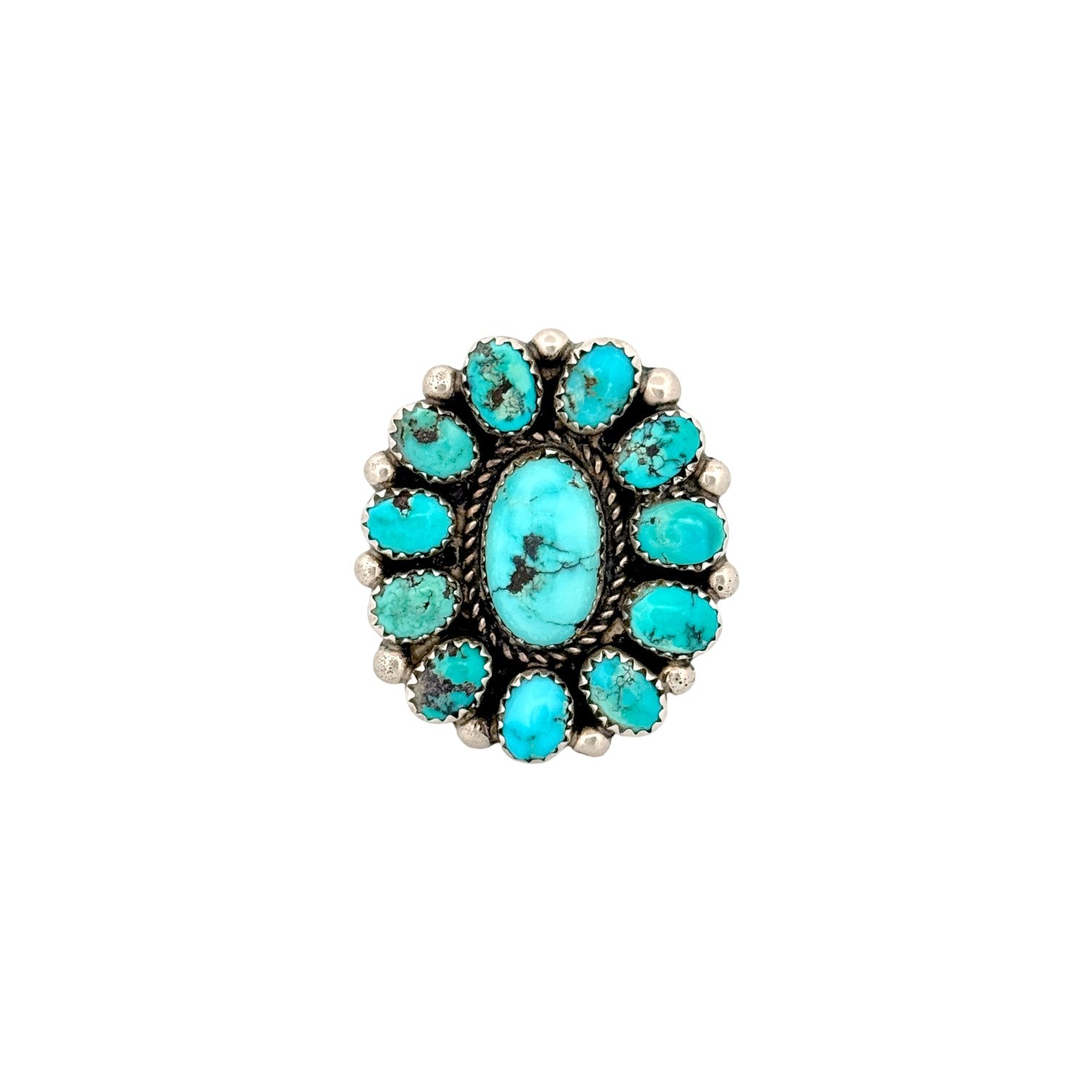 This vintage 1990’s Navajo ring showcases a beautiful cluster of Sleeping Beauty turquoise, prized for its bright sky-blue color and gentle matrix. The center stone is surrounded by matching oval stones, each set in sterling silver with traditional hand-cut bezels. Twisted wire accents and silver drops add depth and texture, enhancing the classic cluster silhouette. The craftsmanship reflects the elegance and detail characteristic of Navajo silversmiths during this era. This handmade ring is a timeless Southwestern piece that highlights the enduring beauty of Sleeping Beauty turquoise.