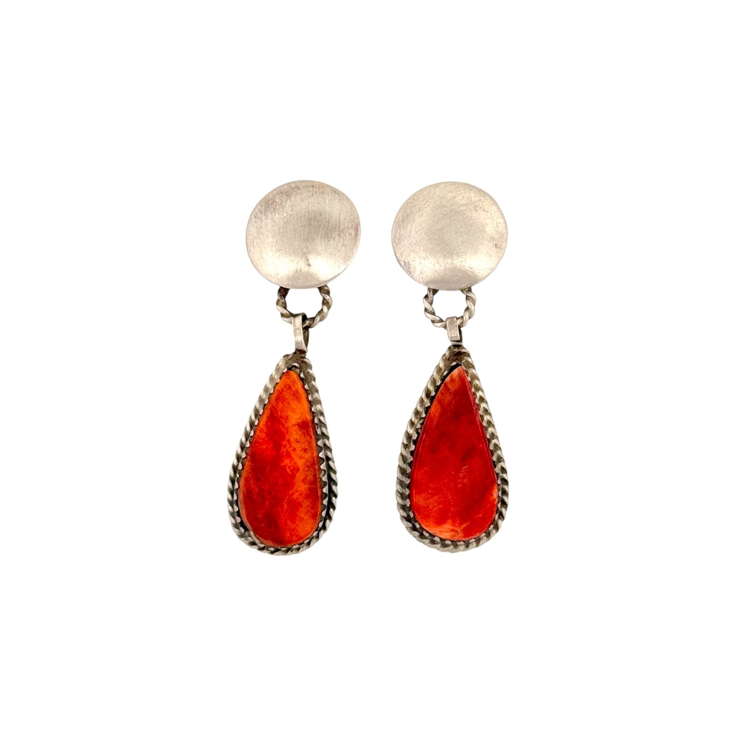 These radiant earrings by Navajo artist Selena Warner feature brilliant Spiny Oyster Shell stones, glowing with rich shades of fiery orange and coral red. Each teardrop-shaped stone is hand-cut and set in a finely crafted sterling silver bezel, framed by a traditional twisted rope border that enhances the stone’s natural luster. The earrings hang gracefully from smooth, round silver posts, creating a perfect balance of elegance and Southwestern charm. Warner’s craftsmanship reflects generations of Navajo silversmithing tradition, blending vibrant natural materials with refined metalwork. The bold color of the Spiny Oyster evokes the warmth of desert sunsets and the spirit of resilience.