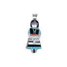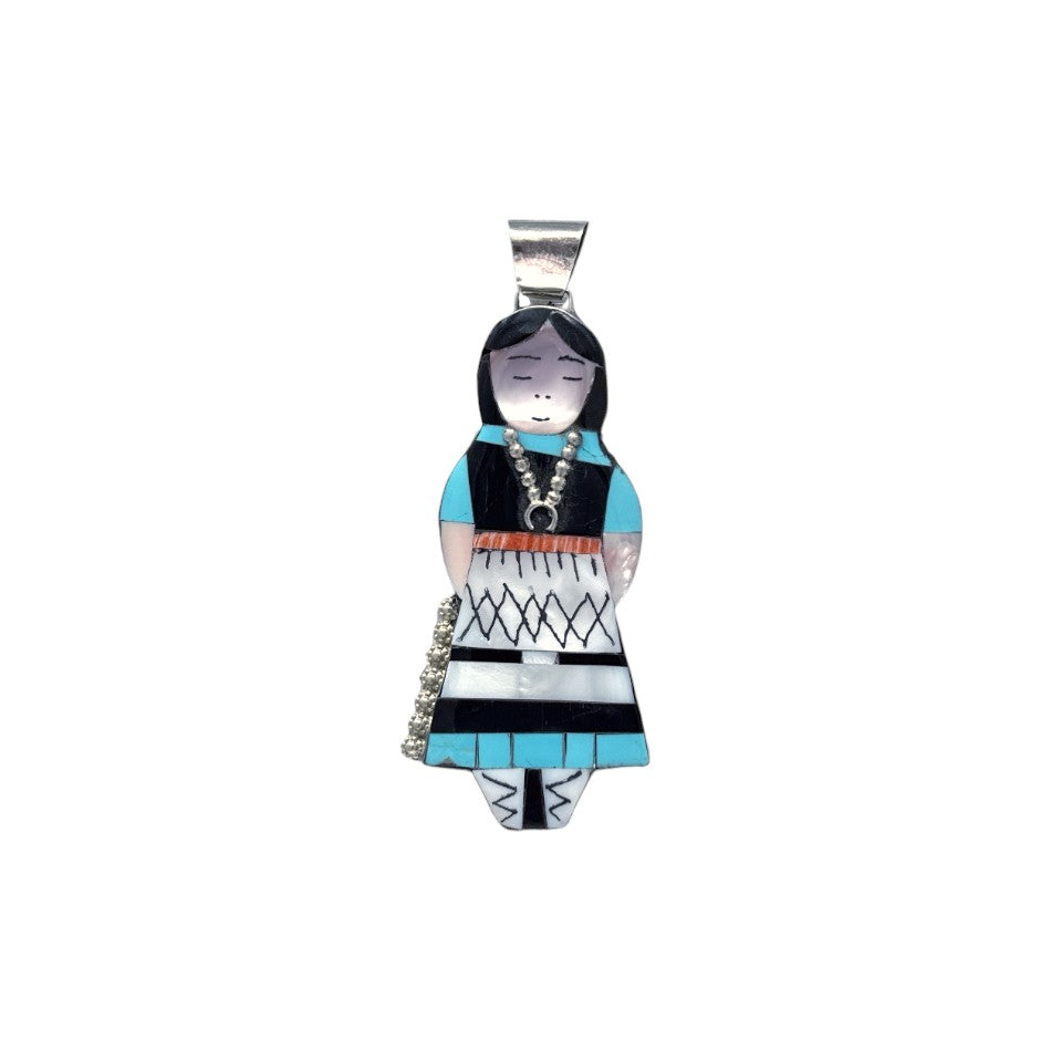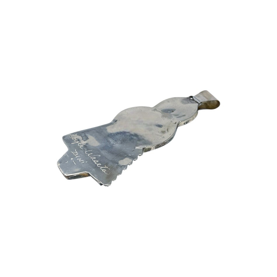 This charming pendant by Joyce Waseta beautifully depicts a traditional Zuni maiden, skillfully crafted in coral, multi-stone inlay, and sterling silver. Each stone ranging from blue turquoise, jet, and mother of pearl is precisely cut and fitted to form the figure's intricate attire, facial features, and jewelry. The maiden’s dress features hand etched patterns, echoing traditional Zuni textile designs, and she wears a detailed squash blossom necklace made from silver drops. Joyce Waseta’s attention to cultural detail and fine craftsmanship brings this piece to life with warmth and personality. The smooth finish and expertly aligned stones speak to her mastery of the mosaic inlay technique.