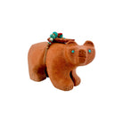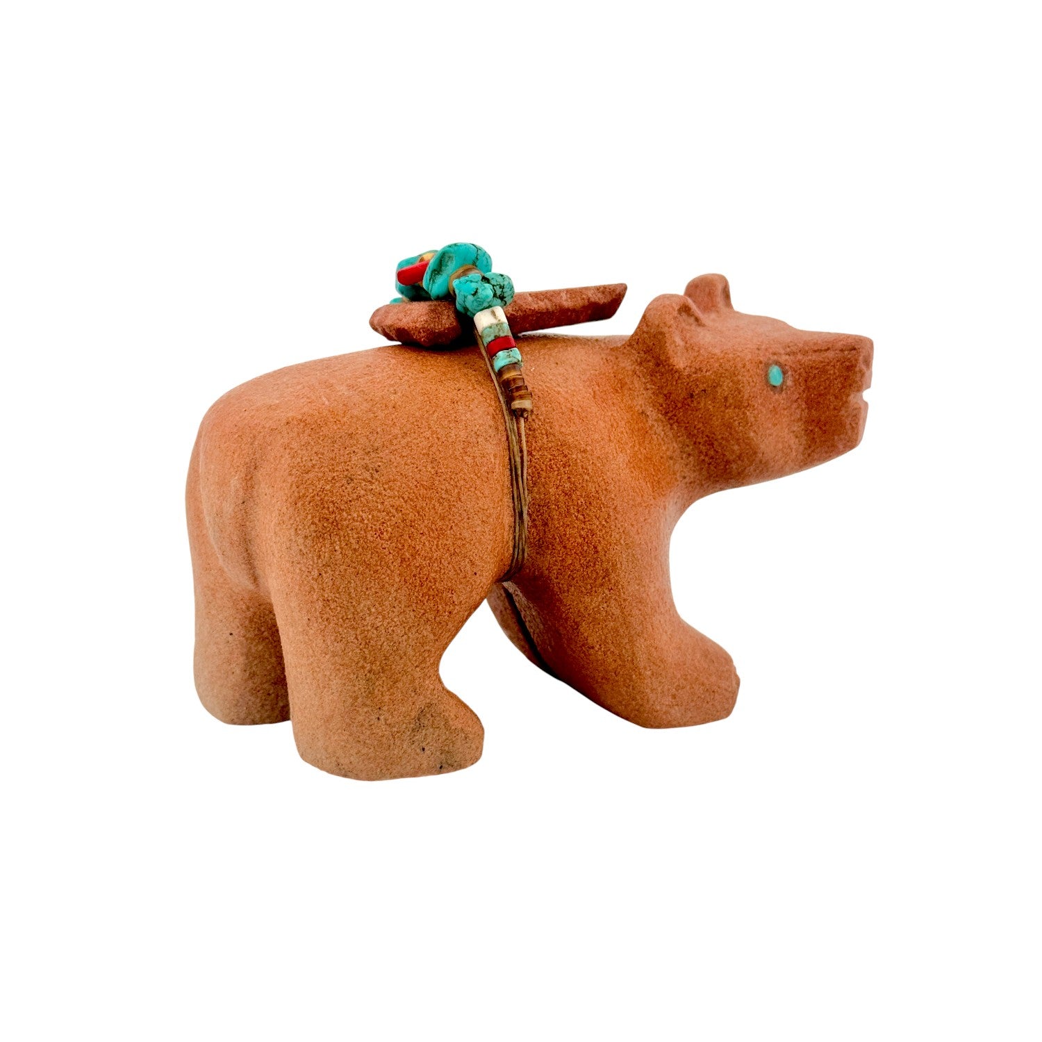 This Zuni hand-carved Bear Fetish by Darrell Westika is sculpted from warm, finely textured sandstone, giving the piece a soft yet substantial presence. The bear’s strong, forward stance represents protection, healing, and quiet strength within Zuni tradition. A detailed medicine bundle rests across its back, featuring Sleeping Beauty Turquoise, Kingman Turquoise, coral, and yellow shell for vibrant color and spiritual significance. The bright inlay contrasts beautifully against the earthy sandstone, highlighting the careful craftsmanship and balanced design. Rich in symbolism and expertly carved, this handcrafted fetish is a striking example of authentic Zuni artistry.
