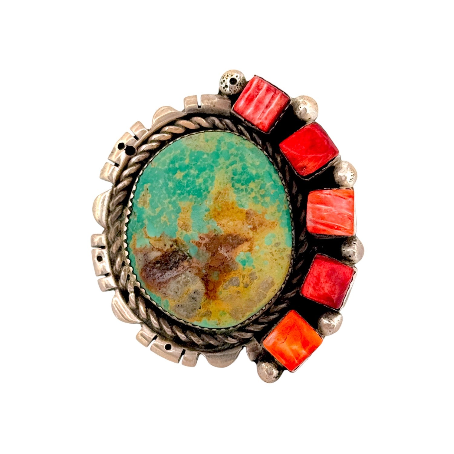This bold and colorful ring by Navajo artist Sampson Whitegoat beautifully combines Royston turquoise with red and orange spiny oyster shell, creating a stunning contrast that captures the essence of Southwestern artistry. The oval turquoise stone, with its natural blend of sky-blue and golden-brown matrix, serves as the centerpiece and is bordered by square-cut spiny oyster shells. Set in sterling silver, the design is framed by a twisted rope bezel and accented with hand-stamped and beaded details, enhancing the texture and depth of the piece. Each stone is hand-selected for its unique color and pattern, making every ring a true one-of-a-kind creation. Sampson Whitegoat’s silversmithing combines traditional Navajo techniques with bold, modern expression.