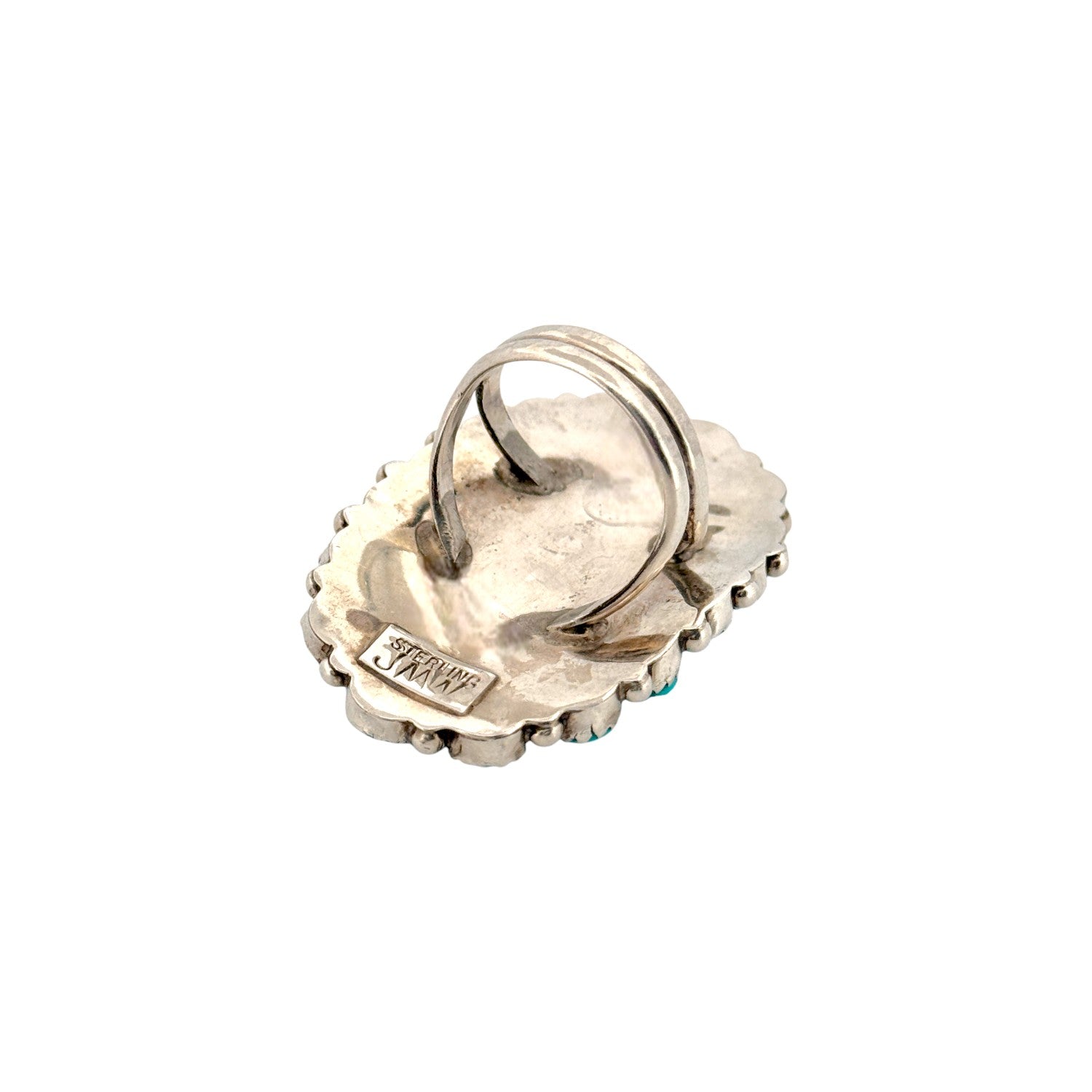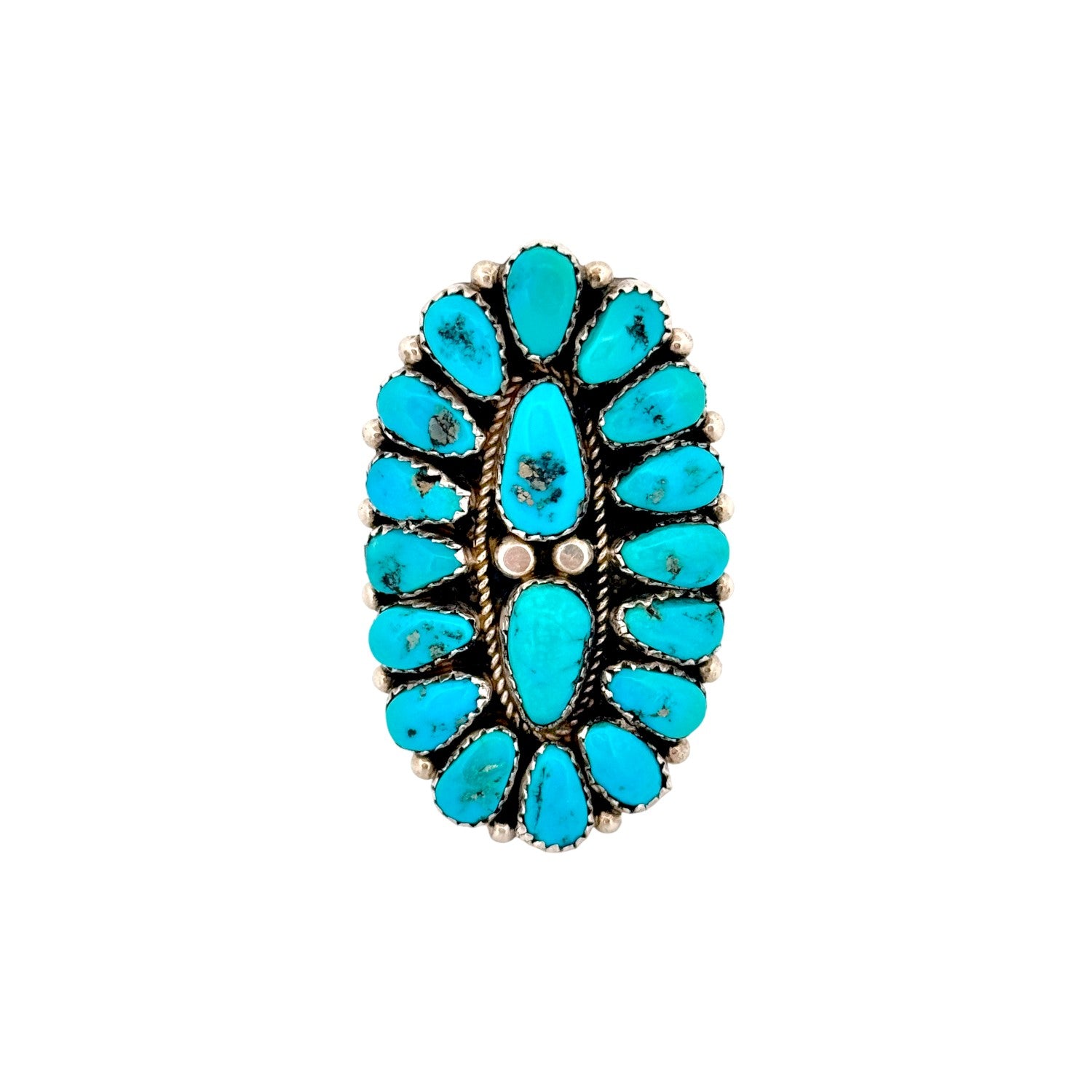 This Jazz Wilson ring features a stunning cluster of Lone Mountain turquoise, prized for its vivid blue tones and distinctive matrix. Each stone is hand-cut and expertly set in sterling silver with traditional Navajo bezels. Twisted wire accents and finely placed silver drops add depth and dimension to the elongated oval design. The craftsmanship reflects Wilson’s skill in balancing bold turquoise presence with refined silver detailing. This Navajo handmade ring is a striking statement piece that showcases exceptional turquoise and time-honored artistry.
