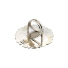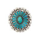 Expertly handcrafted by Navajo silversmith Kyle Wilson, this multi-stone sterling silver ring radiates bold beauty and exceptional craftsmanship. The piece features a brilliant green turquoise cabochon at its center, surrounded by a stunning burst of red coral inlay meticulously hand-set in a circular sunburst pattern. Each element is framed by detailed silverwork, twisted rope accents and scalloped edges that showcase Wilson’s precision and artistry. The harmonious blend of turquoise and coral symbolizes the balance of earth and life, a central theme in Navajo tradition. With its substantial weight and refined polish, this ring embodies both strength and elegance, making it a standout statement piece.