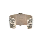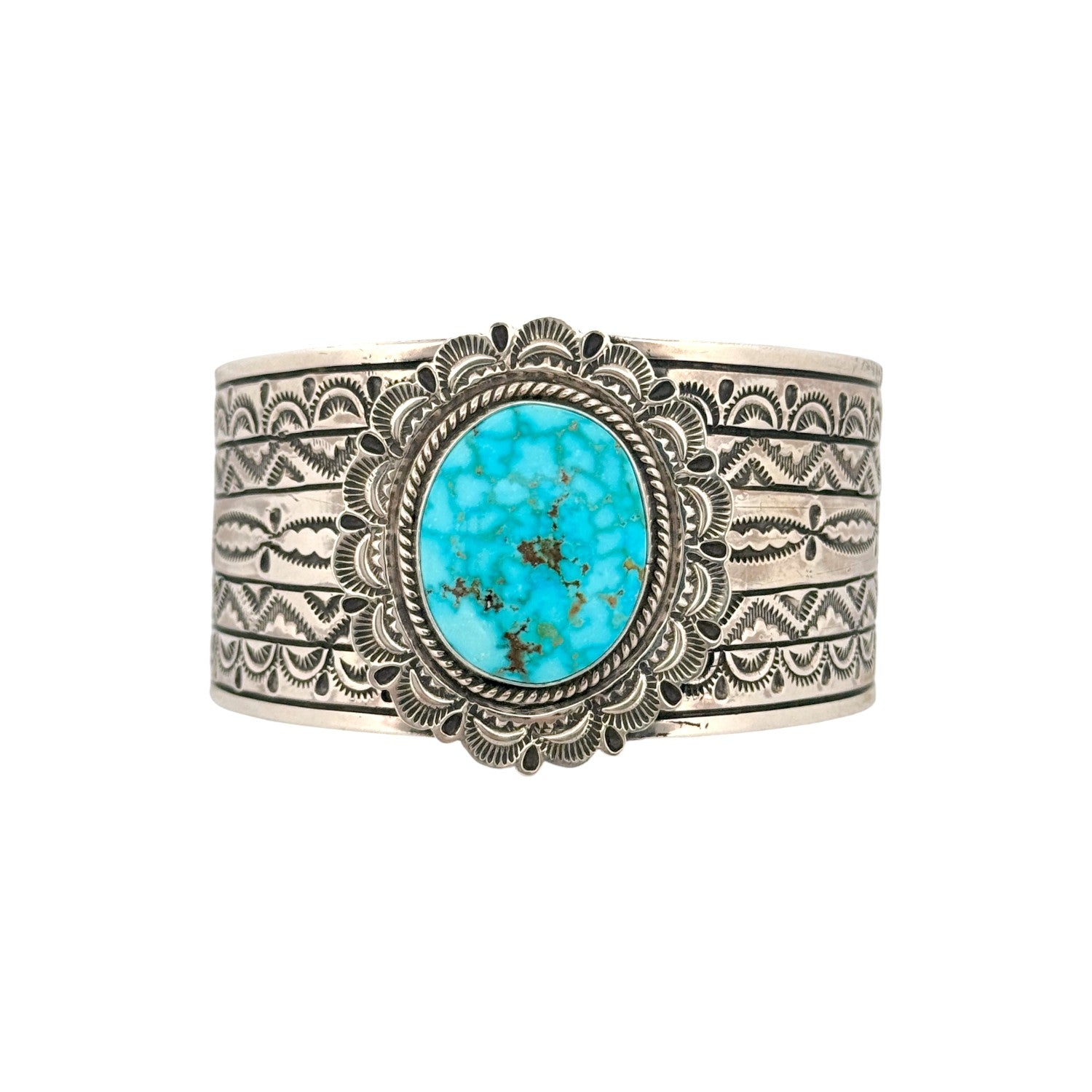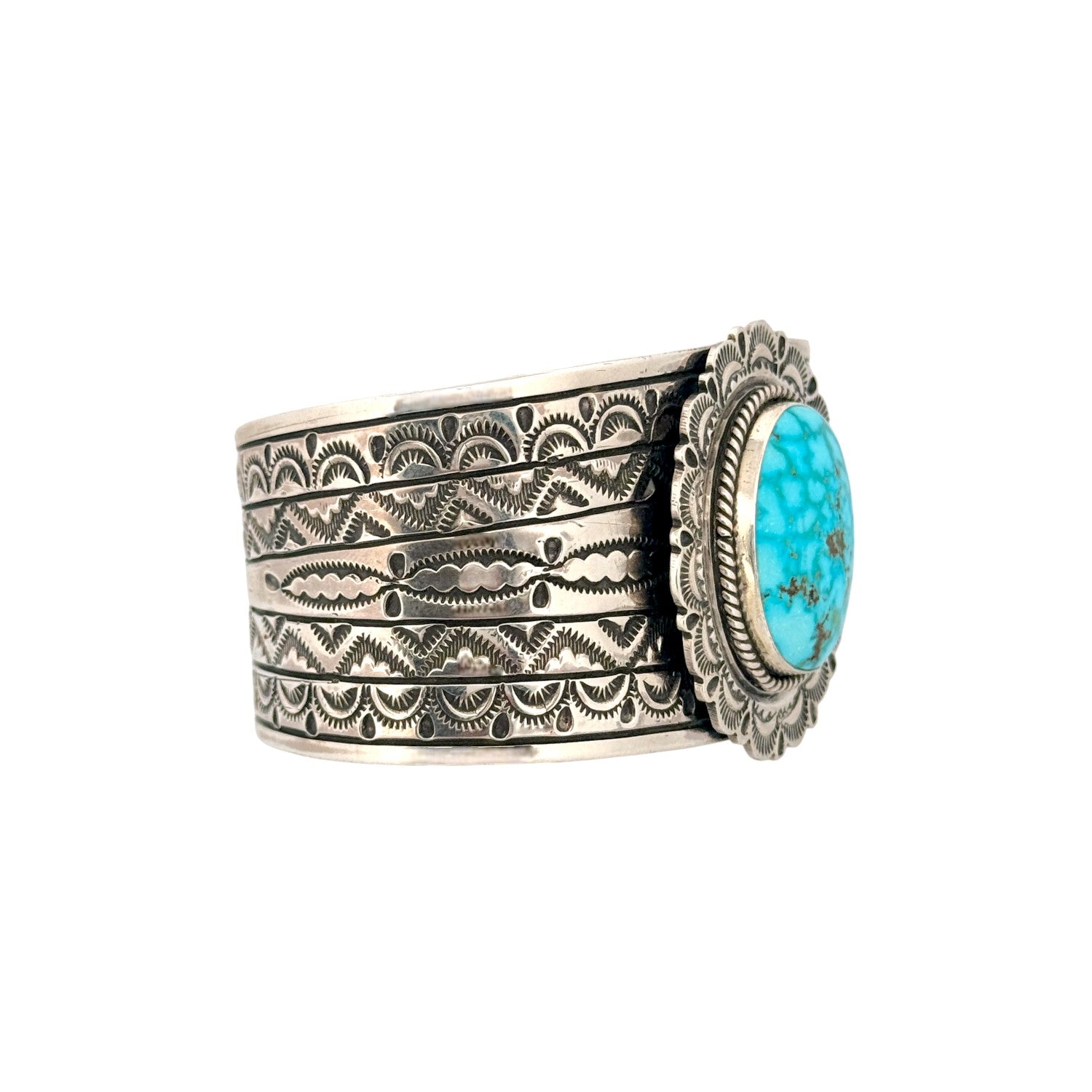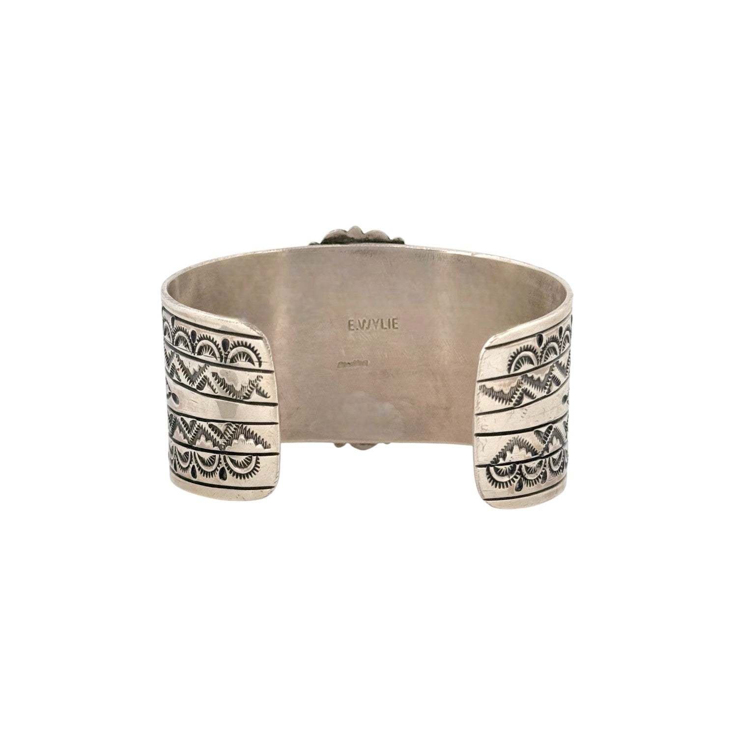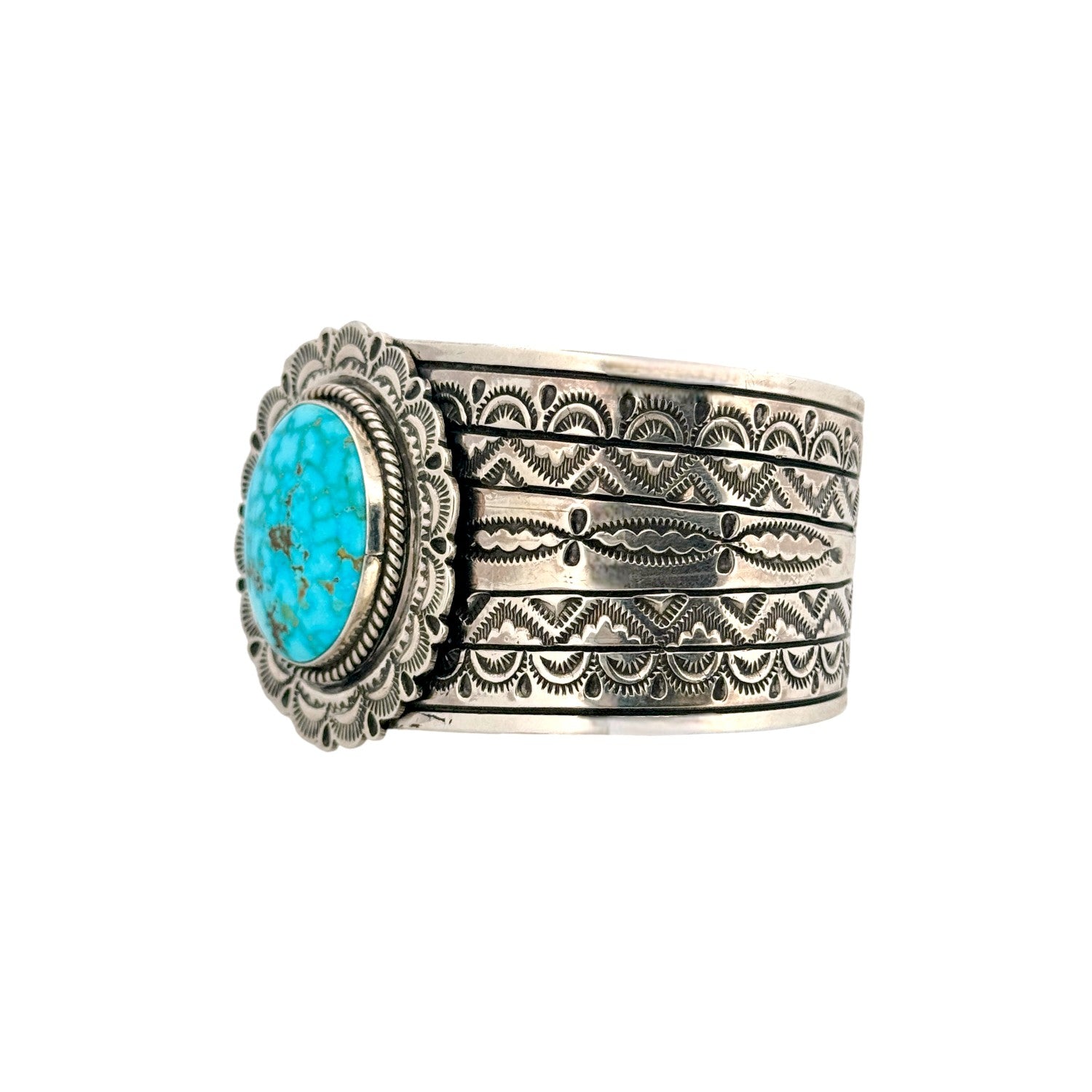 This Navajo handmade bracelet by Eula Wylie features a stunning Waterweb Kingman turquoise stone as its centerpiece. The vibrant oval cabochon is framed by a beautifully scalloped and hand-twisted sterling silver bezel. Intricate stampwork spans the wide cuff, showcasing traditional Navajo patterns with impressive symmetry and depth. Each carefully etched line and design element highlights Wylie’s refined silversmithing skill. Bold and elegant, this bracelet is a timeless expression of Navajo artistry.