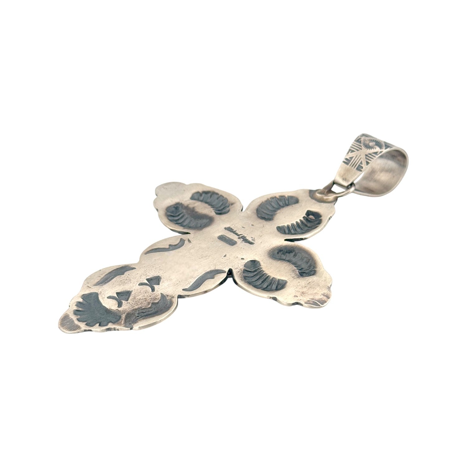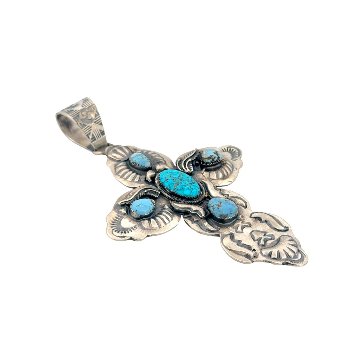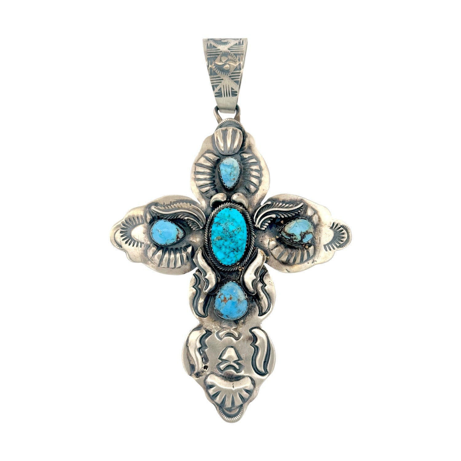 This Navajo handmade pendant by Richard Yazza is beautifully crafted in a bold cross design using sterling silver. At its center rests a vibrant Nevada Blue turquoise stone, complemented by Golden Hills turquoise accents above and below. Detailed stampwork and graceful repoussé patterns bring depth, texture, and a traditional Navajo aesthetic to the piece. Each turquoise stone is carefully set in a hand-cut bezel, enhancing the pendant’s rich color contrast. Elegant and expressive, this pendant reflects Yazza’s exceptional artistry and deep cultural craftsmanship.