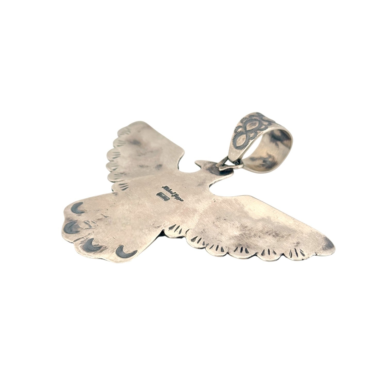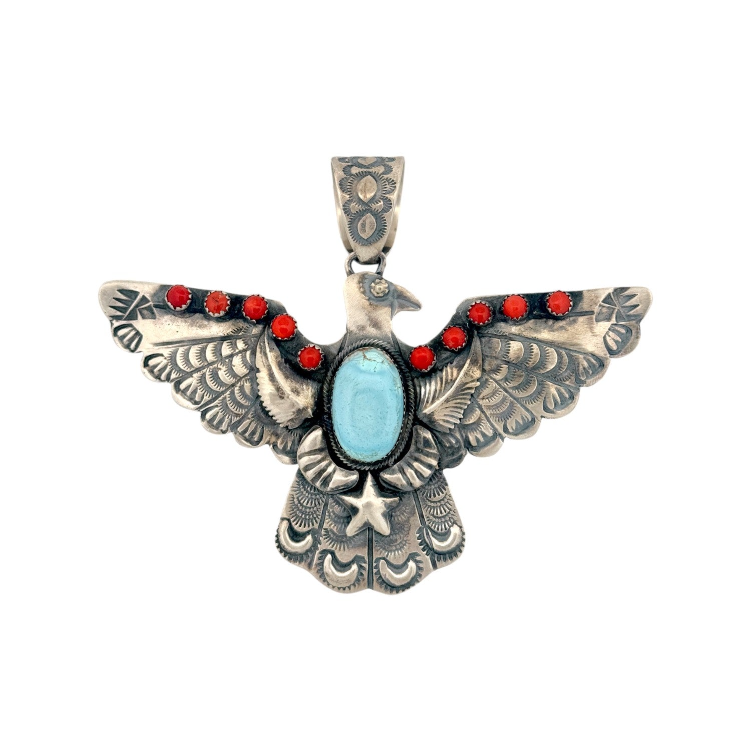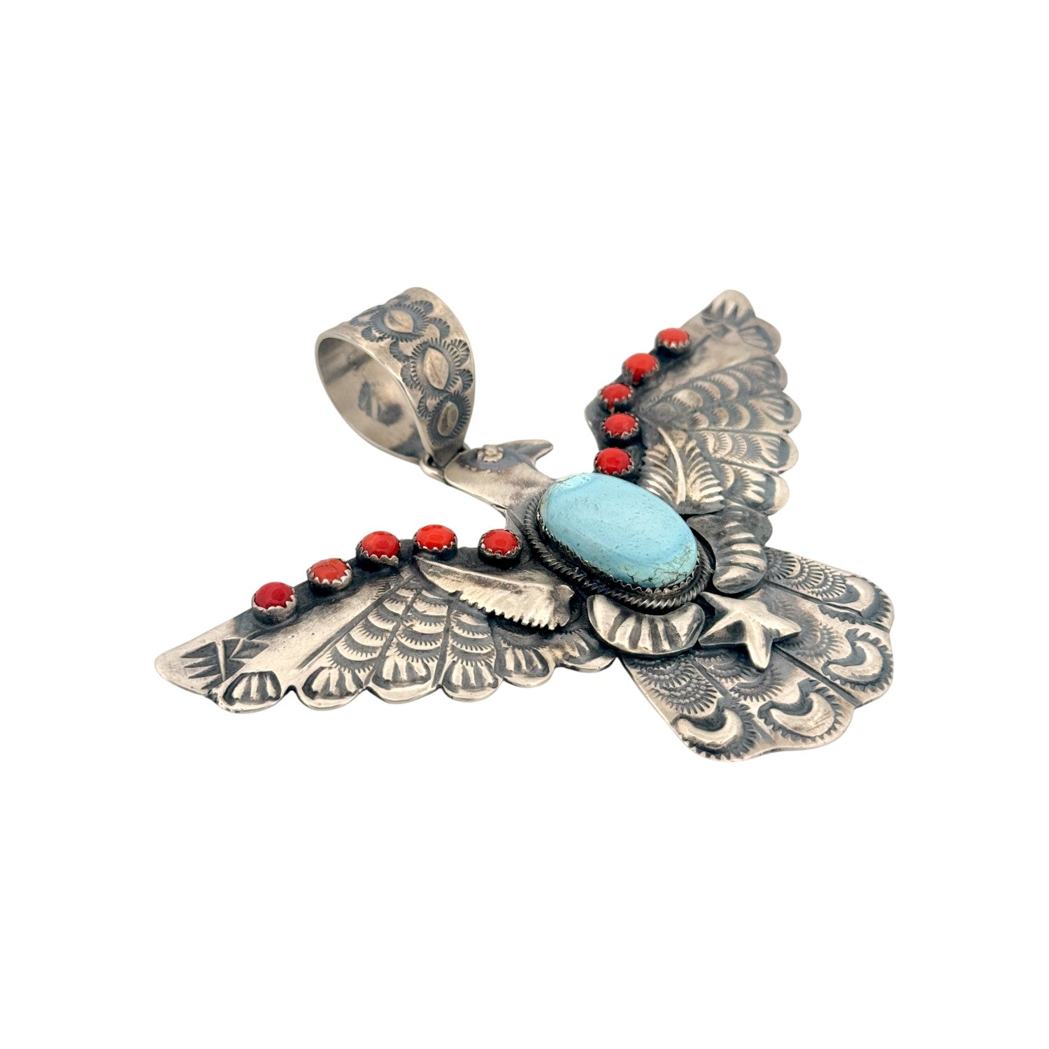 This Navajo handmade pendant by Richard Yazzie showcases a striking thunderbird design crafted in sterling silver. At the center sits a smooth Golden Hills turquoise stone, adding a soft, sky-blue focal point to the piece. The wings are lined with vivid red spiny oyster shell cabochons, creating a bold contrast that draws the eye outward. Intricate stamp work, detailed feathers, and traditional repoussé elements highlight Yazzie’s refined silversmithing style. Powerful and symbolic, this pendant beautifully blends vibrant stones with masterful Navajo artistry.