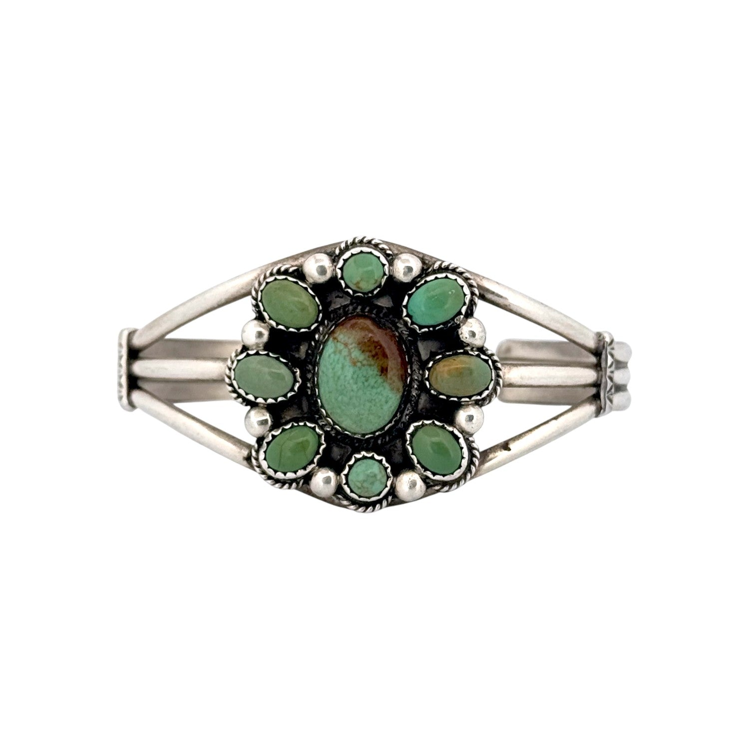 This stunning Navajo handmade bracelet by Phillip Yazzie highlights the rich tones of Green Kingman Turquoise, beautifully arranged in a classic cluster design. Each stone displays natural variations of green and brown matrix, bringing depth and character to the piece. The stones are set in hand-twisted sterling silver rope detailing, framed with polished silver beads for a traditional Navajo finish. The split-shank cuff design provides a comfortable fit while maintaining balance and strength.
